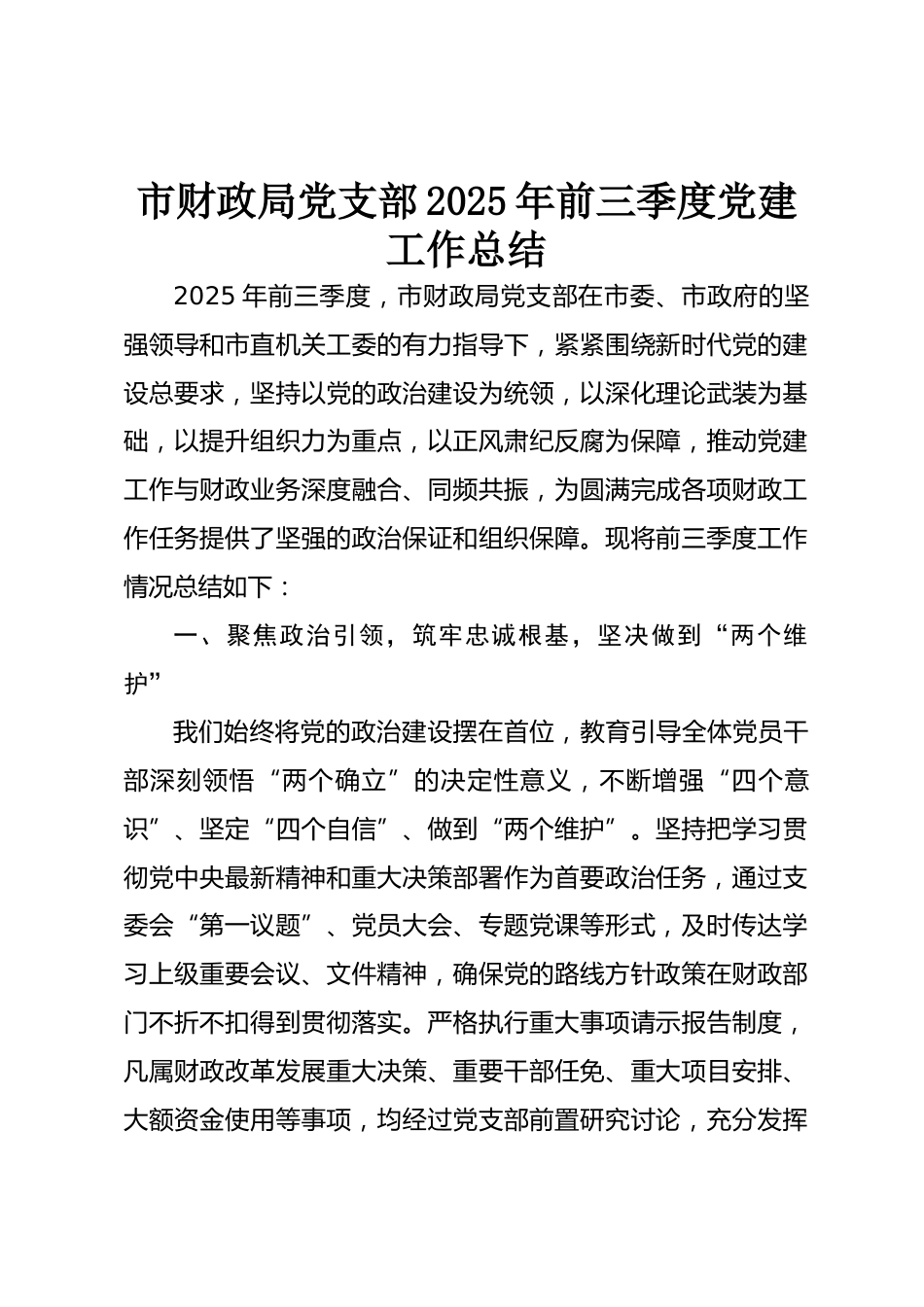 市財(cái)政局黨支部2025年前三季度黨建工作總結(jié)2025年前三季度,市財(cái)政局黨支部在市委、市政府的堅(jiān)強(qiáng)領(lǐng)導(dǎo)和市直機(jī)關(guān)工委的有力指導(dǎo)下,緊緊圍繞新時(shí)代黨的建設(shè)總要求,堅(jiān)持以黨的政治建設(shè)為統(tǒng)領(lǐng),以深化理論武裝為基礎(chǔ),以提升組織力為重點(diǎn),以正風(fēng)肅紀(jì)反腐為保障,推動(dòng)黨建工作與財(cái)政業(yè)務(wù)深度融合、同頻共振,為圓滿(mǎn)完成各項(xiàng)財(cái)政工作任務(wù)提供了堅(jiān)強(qiáng)的政治保證和組織保障。現(xiàn)將前三季度工作情況總結(jié)如下:一、聚焦政治引領(lǐng),筑牢忠誠(chéng)根基,堅(jiān)決做到“兩個(gè)維護(hù)”我們始終將黨的政治建設(shè)擺在首位,教育引導(dǎo)全體黨員干部深刻領(lǐng)悟“兩個(gè)確立”的決定性意義,不斷增強(qiáng)“四個(gè)意識(shí)”...