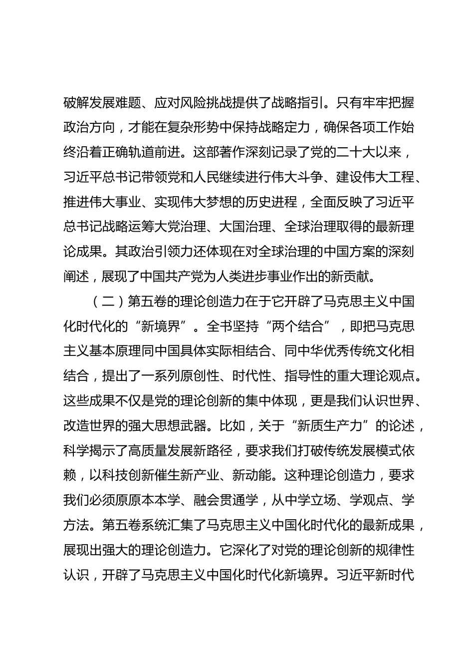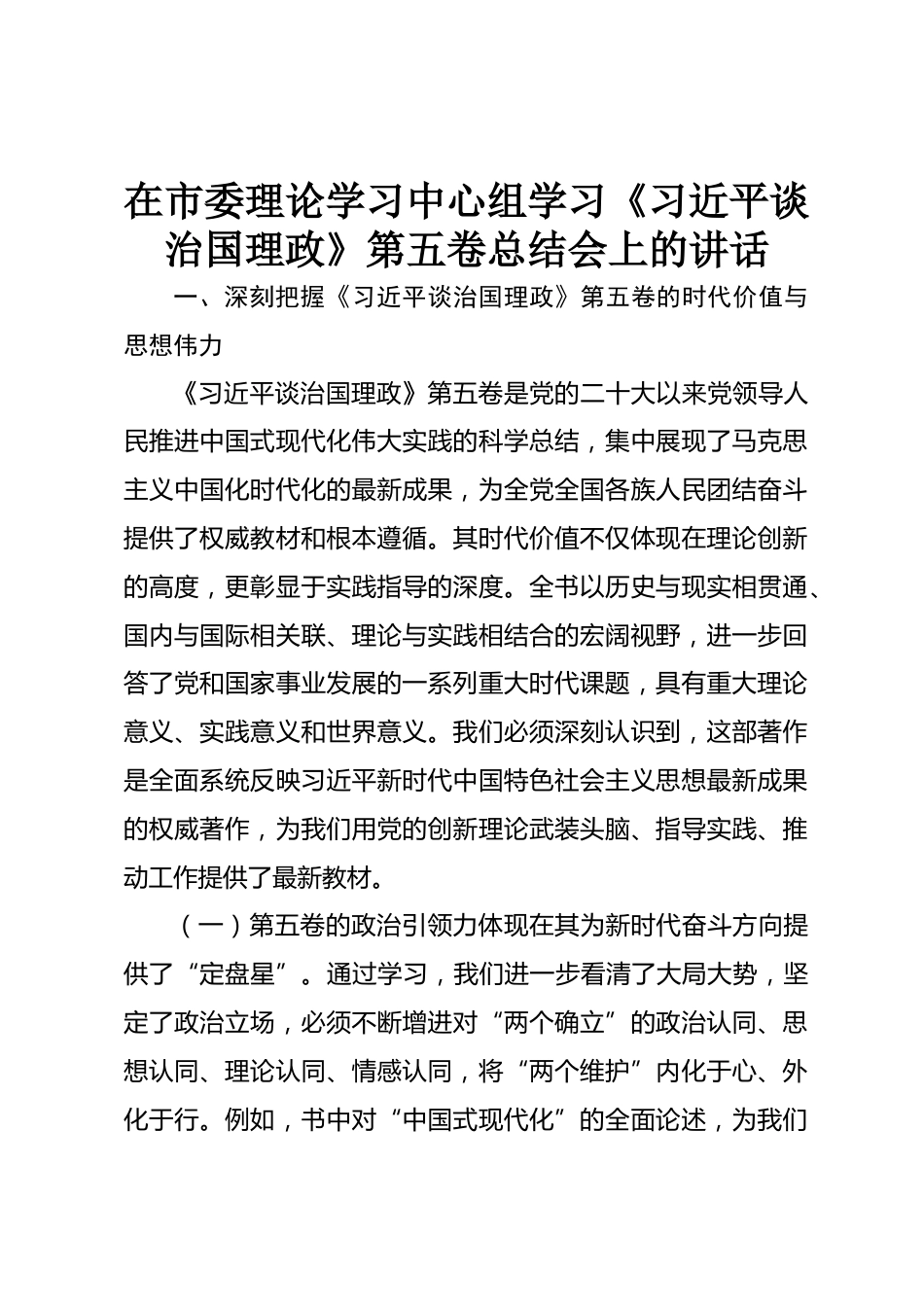 在市委理論學(xué)習(xí)中心組學(xué)習(xí)《習(xí)近平談治國(guó)理政》第五卷總結(jié)會(huì)上的講話一、深刻把握《習(xí)近平談治國(guó)理政》第五卷的時(shí)代價(jià)值與思想偉力《習(xí)近平談治國(guó)理政》第五卷是黨的二十大以來(lái)黨領(lǐng)導(dǎo)人民推進(jìn)中國(guó)式現(xiàn)代化偉大實(shí)踐的科學(xué)總結(jié),集中展現(xiàn)了馬克思主義中國(guó)化時(shí)代化的最新成果,為全黨全國(guó)各族人民團(tuán)結(jié)奮斗提供了權(quán)威教材和根本遵循。其時(shí)代價(jià)值不僅體現(xiàn)在理論創(chuàng)新的高度,更彰顯于實(shí)踐指導(dǎo)的深度。全書(shū)以歷史與現(xiàn)實(shí)相貫通、國(guó)內(nèi)與國(guó)際相關(guān)聯(lián)、理論與實(shí)踐相結(jié)合的宏闊視野,進(jìn)一步回答了黨和國(guó)家事業(yè)發(fā)展的一系列重大時(shí)代課題,具有重大理論意義、實(shí)踐意義和世界意義。我們必...