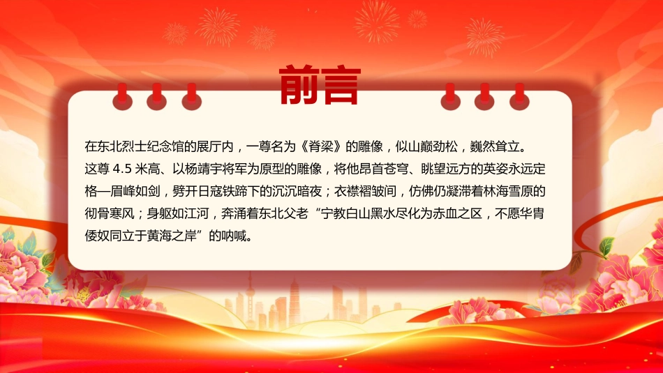 匯報:某某某時間:2025/09/24致敬抗聯(lián)英雄楊靖宇鐵骨忠魂民族脊梁前言在東北烈士紀(jì)念館的展廳內(nèi),一尊名為《脊梁》的雕像,似山巔勁松,巍然聳立。這尊4.5米高、以楊靖宇將軍為原型的雕像,將他昂首蒼穹、眺望遠(yuǎn)方的英姿永遠(yuǎn)定格—眉峰如劍,劈開日寇鐵蹄下的沉沉暗夜;衣襟褶皺間,仿佛仍凝滯著林海雪原的徹骨寒風(fēng);身軀如江河,奔涌著東北父老“寧教白山黑水盡化為赤血之區(qū),不愿華胄倭奴同立于黃海之岸”的吶喊。前言將軍目光如炬,穿透了八十余載光陰:一半是對白山黑水的深情凝視,看松花江浪拍兩岸,看長白山雪覆林海,看他曾用腳步丈量過的每寸山河;一半是對豺...