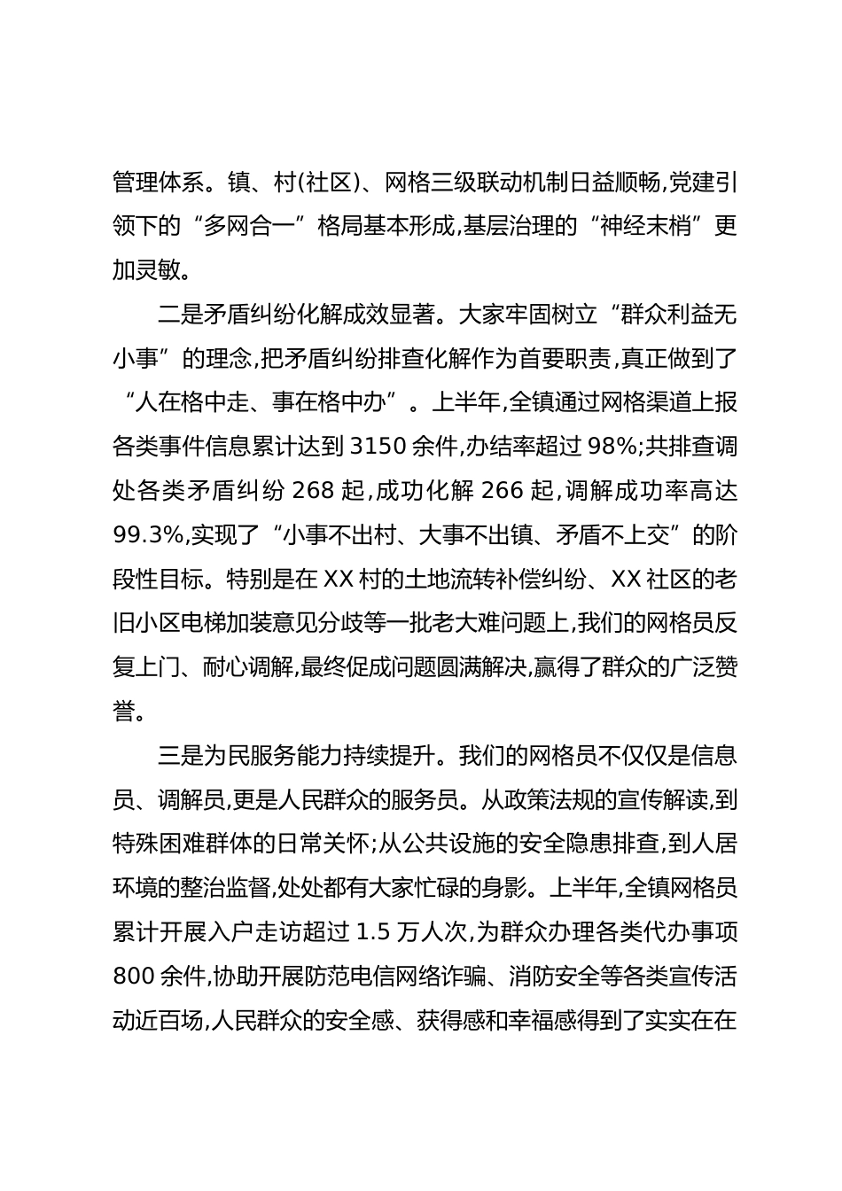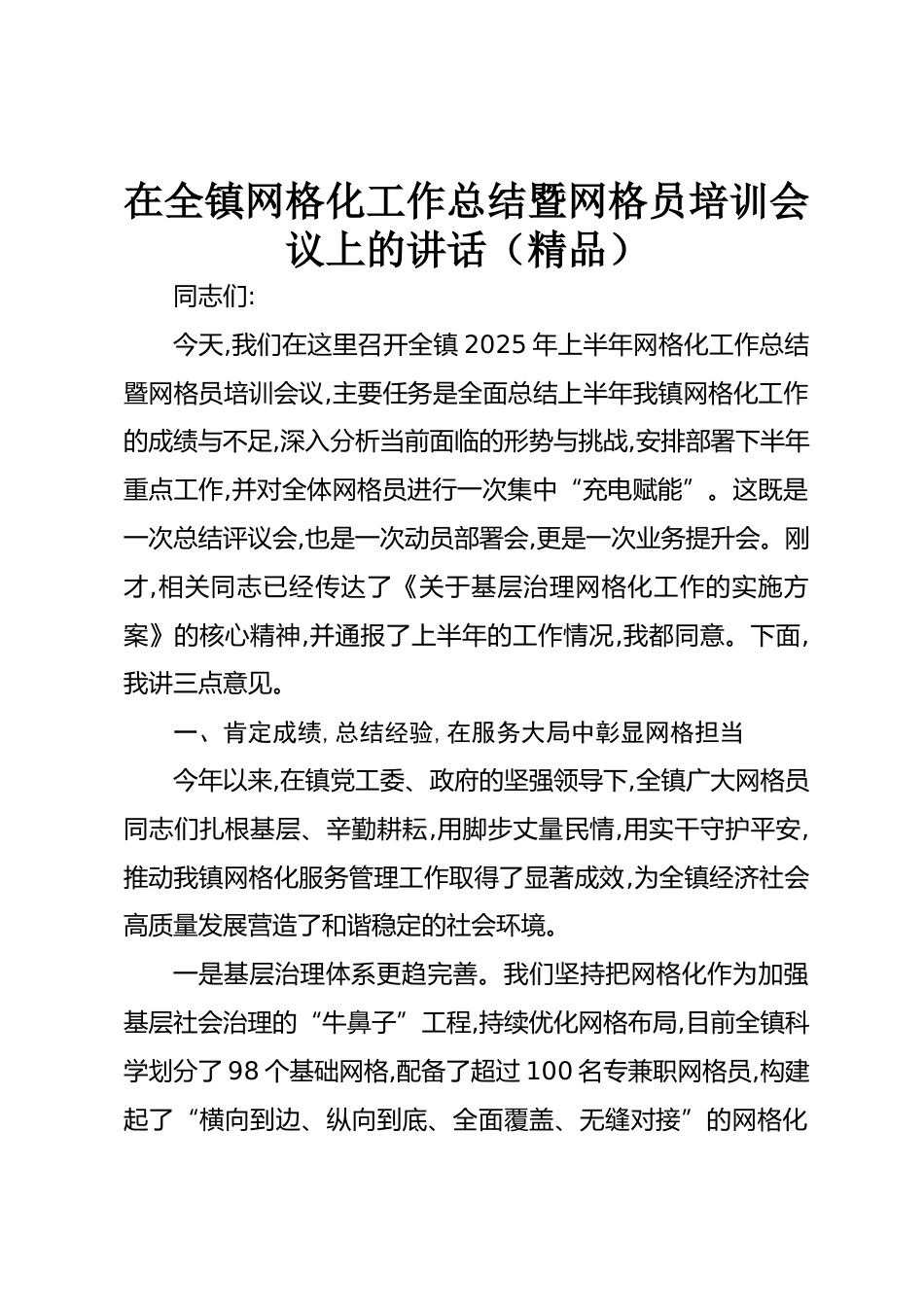 在全鎮(zhèn)網(wǎng)格化工作總結(jié)暨網(wǎng)格員培訓(xùn)會議上的講話(精品)同志們:今天,我們在這里召開全鎮(zhèn)2025年上半年網(wǎng)格化工作總結(jié)暨網(wǎng)格員培訓(xùn)會議,主要任務(wù)是全面總結(jié)上半年我鎮(zhèn)網(wǎng)格化工作的成績與不足,深入分析當(dāng)前面臨的形勢與挑戰(zhàn),安排部署下半年重點工作,并對全體網(wǎng)格員進行一次集中“充電賦能”。這既是一次總結(jié)評議會,也是一次動員部署會,更是一次業(yè)務(wù)提升會。剛才,相關(guān)同志已經(jīng)傳達了《關(guān)于基層治理網(wǎng)格化工作的實施方案》的核心精神,并通報了上半年的工作情況,我都同意。下面,我講三點意見。一、肯定成績,總結(jié)經(jīng)驗,在服務(wù)大局中彰顯網(wǎng)格擔(dān)當(dāng)今年以來,在鎮(zhèn)黨工委、政府的堅強...