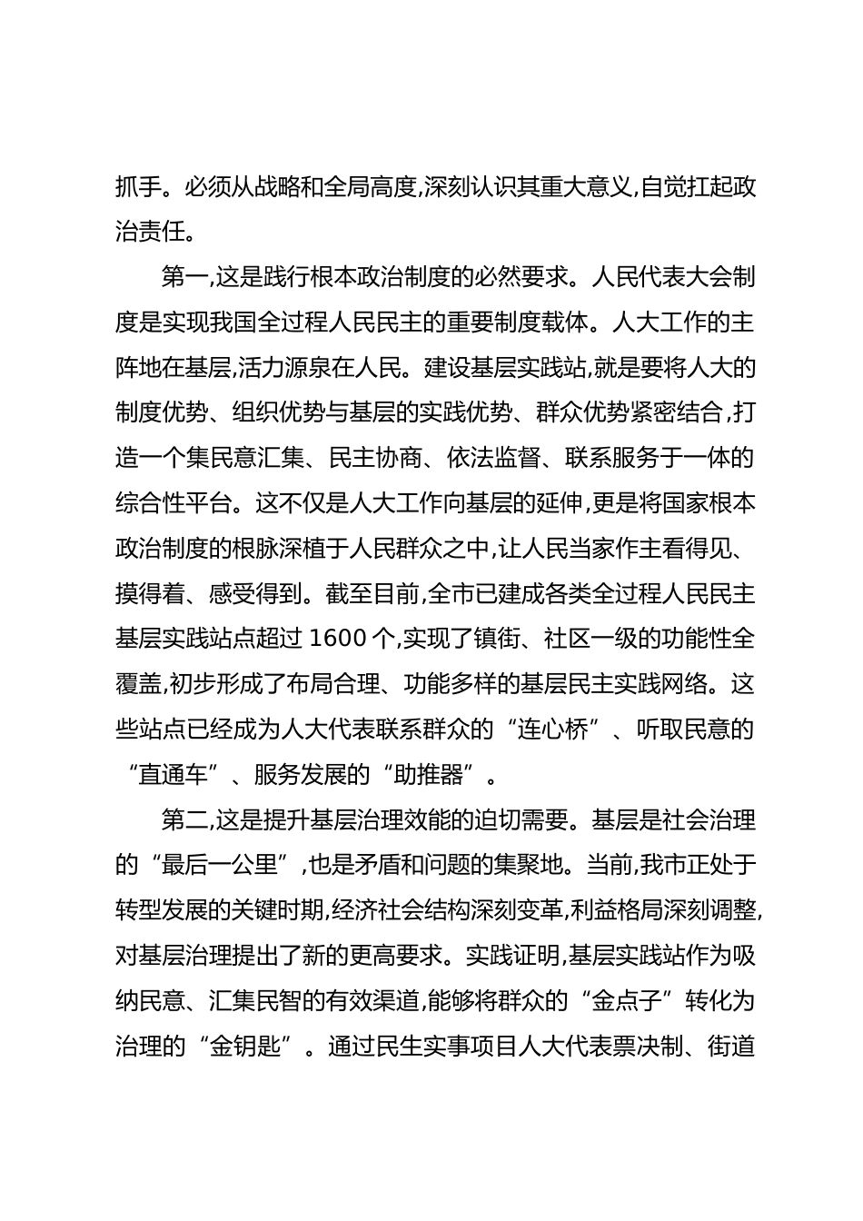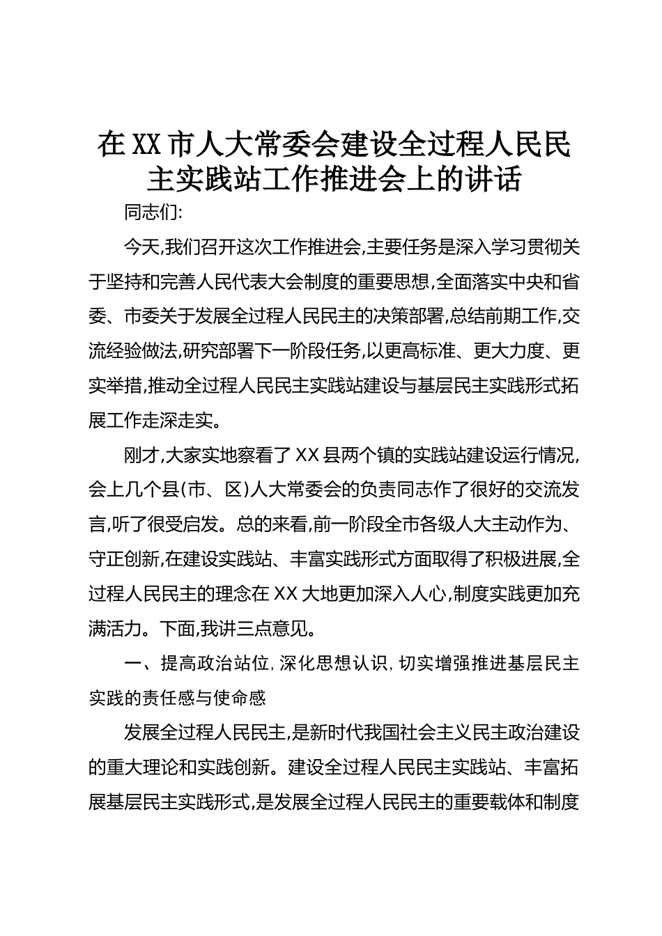 在XX市人大常委會建設(shè)全過程人民民主實(shí)踐站工作推進(jìn)會上的講話同志們:今天,我們召開這次工作推進(jìn)會,主要任務(wù)是深入學(xué)習(xí)貫徹關(guān)于堅(jiān)持和完善人民代表大會制度的重要思想,全面落實(shí)中央和省委、市委關(guān)于發(fā)展全過程人民民主的決策部署,總結(jié)前期工作,交流經(jīng)驗(yàn)做法,研究部署下一階段任務(wù),以更高標(biāo)準(zhǔn)、更大力度、更實(shí)舉措,推動全過程人民民主實(shí)踐站建設(shè)與基層民主實(shí)踐形式拓展工作走深走實(shí)。剛才,大家實(shí)地察看了XX縣兩個鎮(zhèn)的實(shí)踐站建設(shè)運(yùn)行情況,會上幾個縣(市、區(qū))人大常委會的負(fù)責(zé)同志作了很好的交流發(fā)言,聽了很受啟發(fā)??偟膩砜?前一階段全市各級人大主動作為、守正創(chuàng)新,在建設(shè)...