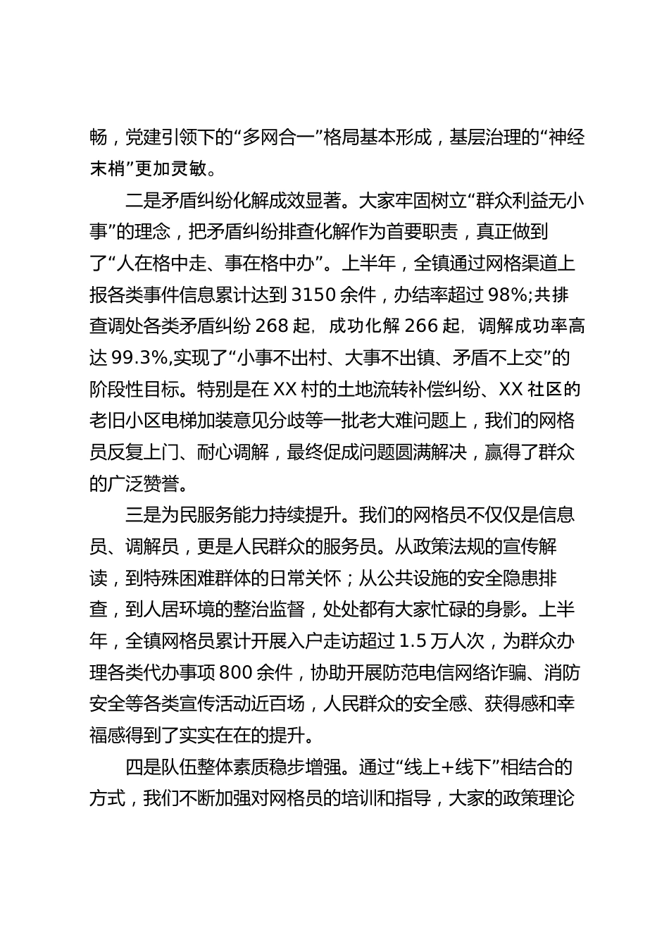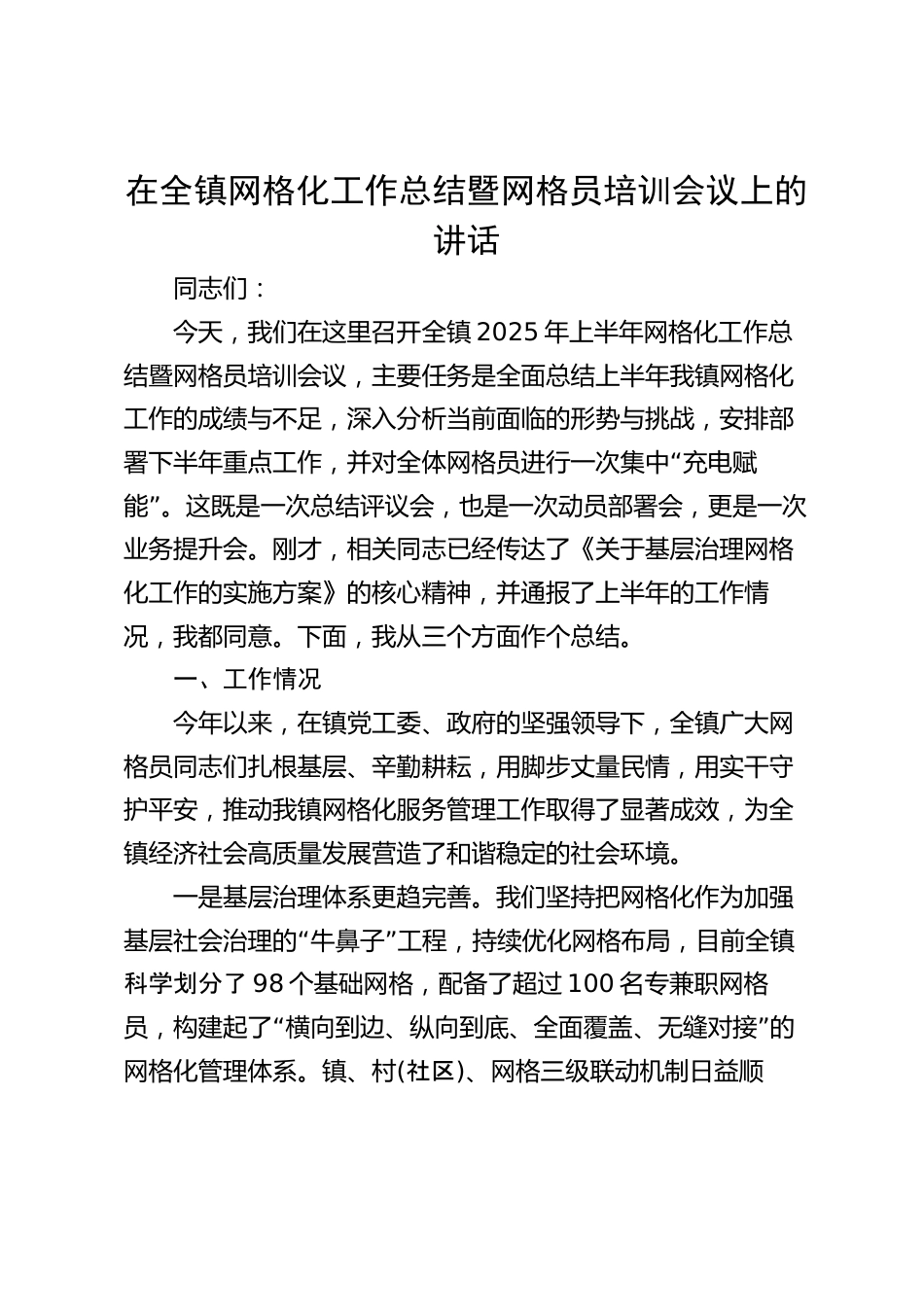 在全鎮(zhèn)網(wǎng)格化工作總結(jié)暨網(wǎng)格員培訓(xùn)會(huì)議上的講話(huà)同志們:今天,我們?cè)谶@里召開(kāi)全鎮(zhèn)2025年上半年網(wǎng)格化工作總結(jié)暨網(wǎng)格員培訓(xùn)會(huì)議,主要任務(wù)是全面總結(jié)上半年我鎮(zhèn)網(wǎng)格化工作的成績(jī)與不足,深入分析當(dāng)前面臨的形勢(shì)與挑戰(zhàn),安排部“署下半年重點(diǎn)工作,并對(duì)全體網(wǎng)格員進(jìn)行一次集中充電賦”能。這既是一次總結(jié)評(píng)議會(huì),也是一次動(dòng)員部署會(huì),更是一次業(yè)務(wù)提升會(huì)。剛才,相關(guān)同志已經(jīng)傳達(dá)了《關(guān)于基層治理網(wǎng)格化工作的實(shí)施方案》的核心精神,并通報(bào)了上半年的工作情況,我都同意。下面,我從三個(gè)方面作個(gè)總結(jié)。一、工作情況今年以來(lái),在鎮(zhèn)黨工委、政府的堅(jiān)強(qiáng)領(lǐng)導(dǎo)下,全鎮(zhèn)廣大網(wǎng)格員...