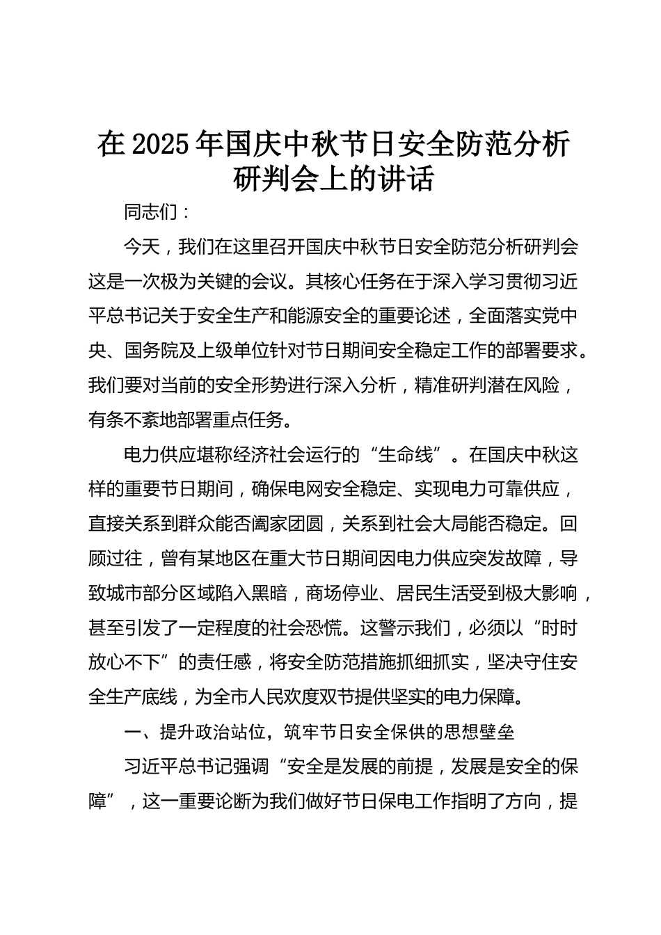在2025年國慶中秋節(jié)日安全防范分析研判會上的講話同志們:今天,我們在這里召開國慶中秋節(jié)日安全防范分析研判會這是一次極為關(guān)鍵的會議。其核心任務(wù)在于深入學(xué)習貫徹習近平總書記關(guān)于安全生產(chǎn)和能源安全的重要論述,全面落實黨中央、國務(wù)院及上級單位針對節(jié)日期間安全穩(wěn)定工作的部署要求。我們要對當前的安全形勢進行深入分析,精準研判潛在風險,有條不紊地部署重點任務(wù)。電力供應(yīng)堪稱經(jīng)濟社會運行的“生命線”。在國慶中秋這樣的重要節(jié)日期間,確保電網(wǎng)安全穩(wěn)定、實現(xiàn)電力可靠供應(yīng),直接關(guān)系到群眾能否闔家團圓,關(guān)系到社會大局能否穩(wěn)定?;仡欉^往,曾有某地區(qū)在重大節(jié)...