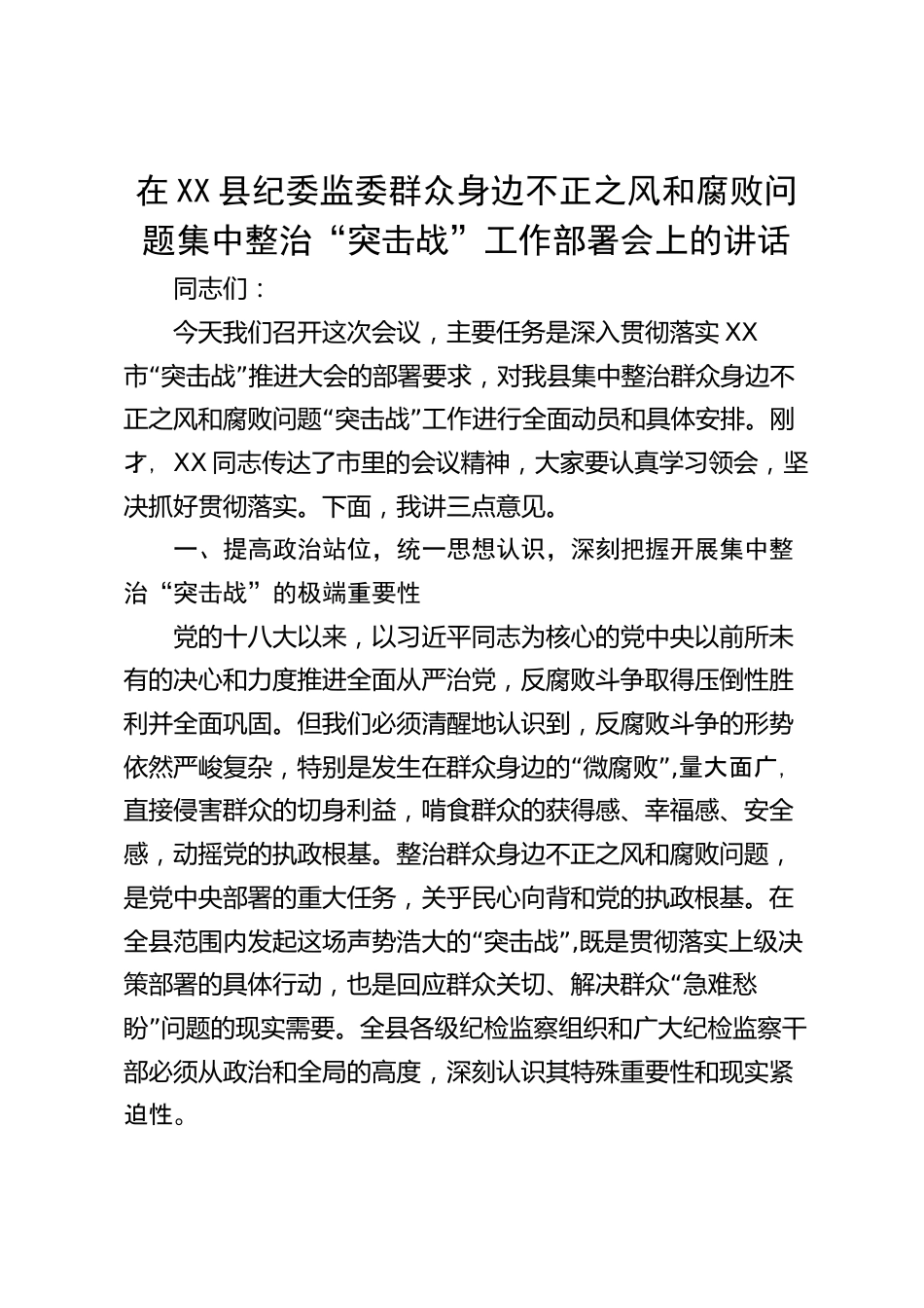 在XX縣紀(jì)委監(jiān)委群眾身邊不正之風(fēng)和腐敗問題集中整治“突擊戰(zhàn)”工作部署會(huì)上的講話同志們:今天我們召開這次會(huì)議,主要任務(wù)是深入貫徹落實(shí)XX“”市突擊戰(zhàn)推進(jìn)大會(huì)的部署要求,對(duì)我縣集中整治群眾身邊不“”正之風(fēng)和腐敗問題突擊戰(zhàn)工作進(jìn)行全面動(dòng)員和具體安排。剛才,XX同志傳達(dá)了市里的會(huì)議精神,大家要認(rèn)真學(xué)習(xí)領(lǐng)會(huì),堅(jiān)決抓好貫徹落實(shí)。下面,我講三點(diǎn)意見。一、提高政治站位,統(tǒng)一思想認(rèn)識(shí),深刻把握開展集中整治“突擊戰(zhàn)”的極端重要性黨的十八大以來,以習(xí)近平同志為核心的黨中央以前所未有的決心和力度推進(jìn)全面從嚴(yán)治黨,反腐敗斗爭取得壓倒性勝利并全面鞏固。但我們...