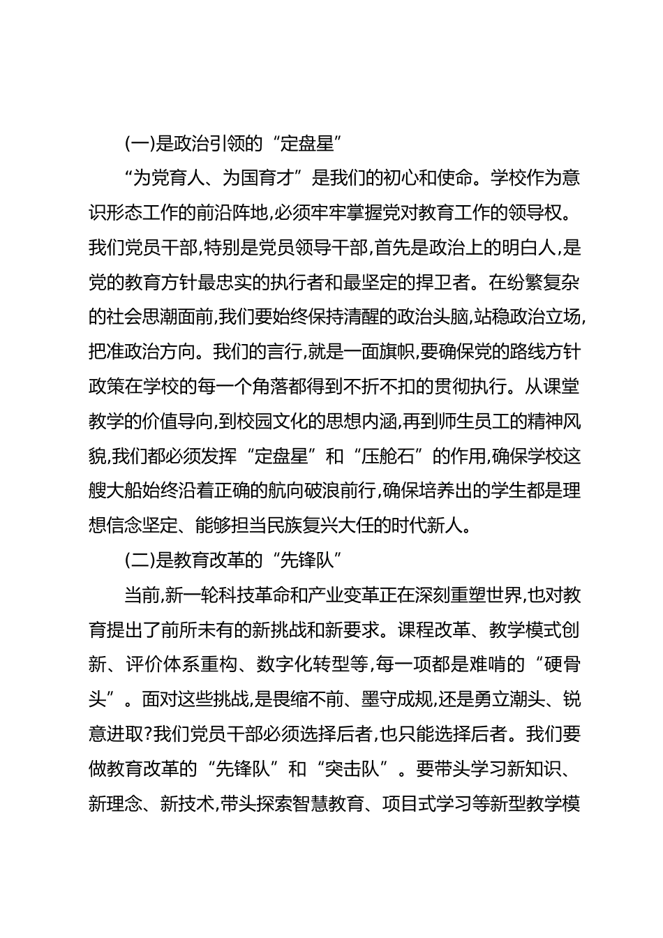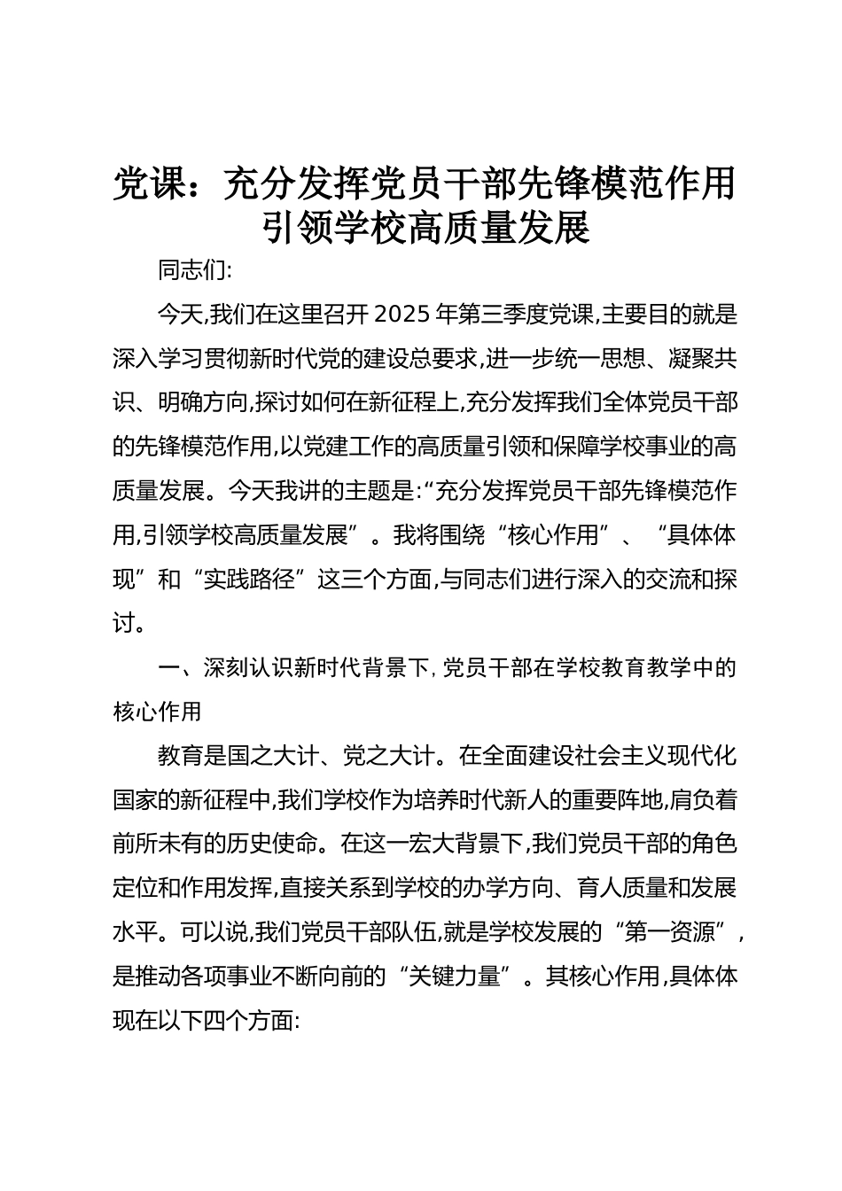 黨課:充分發(fā)揮黨員干部先鋒模范作用引領(lǐng)學(xué)校高質(zhì)量發(fā)展同志們:今天,我們?cè)谶@里召開(kāi)2025年第三季度黨課,主要目的就是深入學(xué)習(xí)貫徹新時(shí)代黨的建設(shè)總要求,進(jìn)一步統(tǒng)一思想、凝聚共識(shí)、明確方向,探討如何在新征程上,充分發(fā)揮我們?nèi)w黨員干部的先鋒模范作用,以黨建工作的高質(zhì)量引領(lǐng)和保障學(xué)校事業(yè)的高質(zhì)量發(fā)展。今天我講的主題是:“充分發(fā)揮黨員干部先鋒模范作用,引領(lǐng)學(xué)校高質(zhì)量發(fā)展”。我將圍繞“核心作用”、“具體體現(xiàn)”和“實(shí)踐路徑”這三個(gè)方面,與同志們進(jìn)行深入的交流和探討。一、深刻認(rèn)識(shí)新時(shí)代背景下,黨員干部在學(xué)校教育教學(xué)中的核心作用教育是國(guó)之大計(jì)、黨之大計(jì)。...