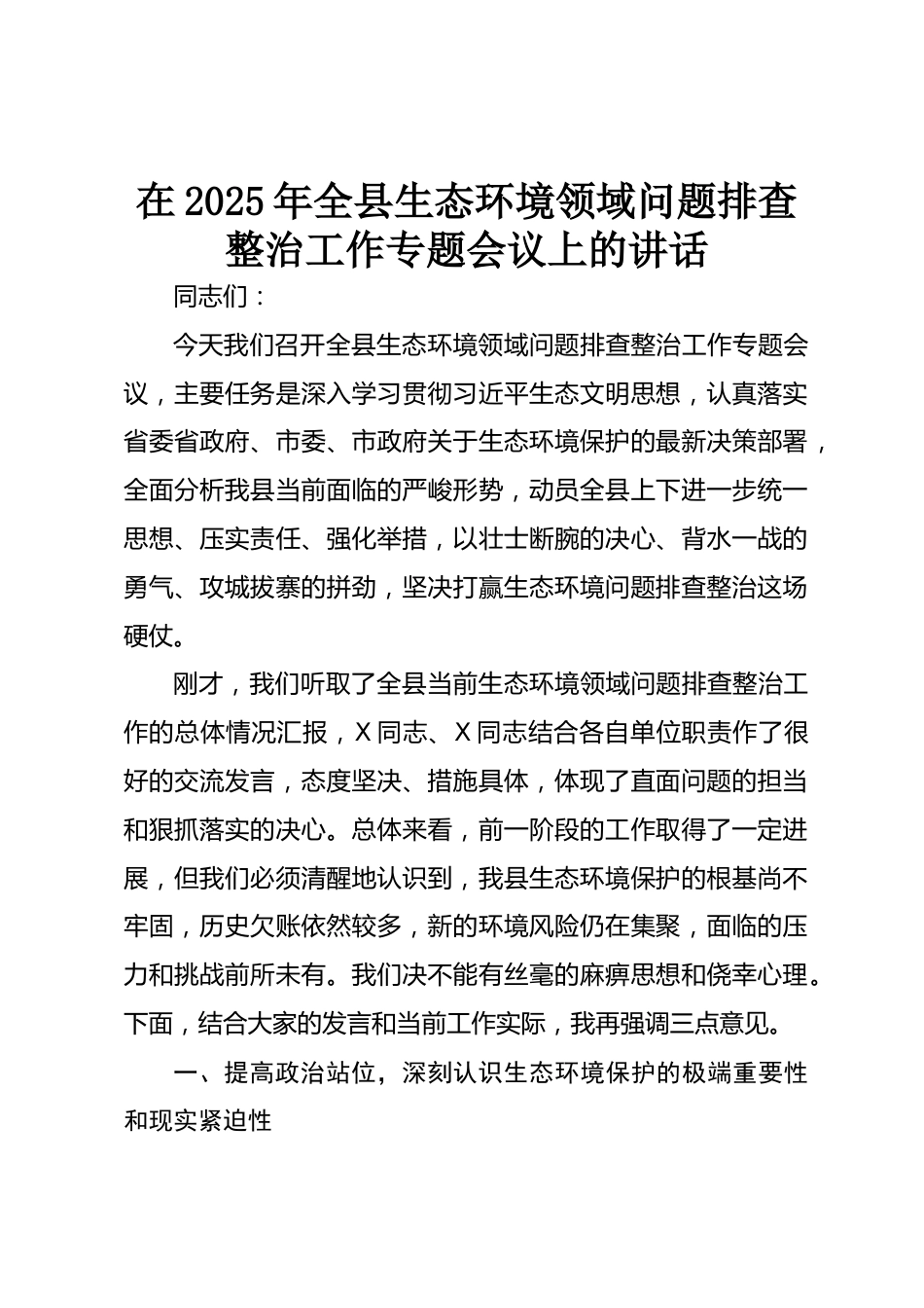 在2025年全縣生態(tài)環(huán)境領(lǐng)域問題排查整治工作專題會議上的講話