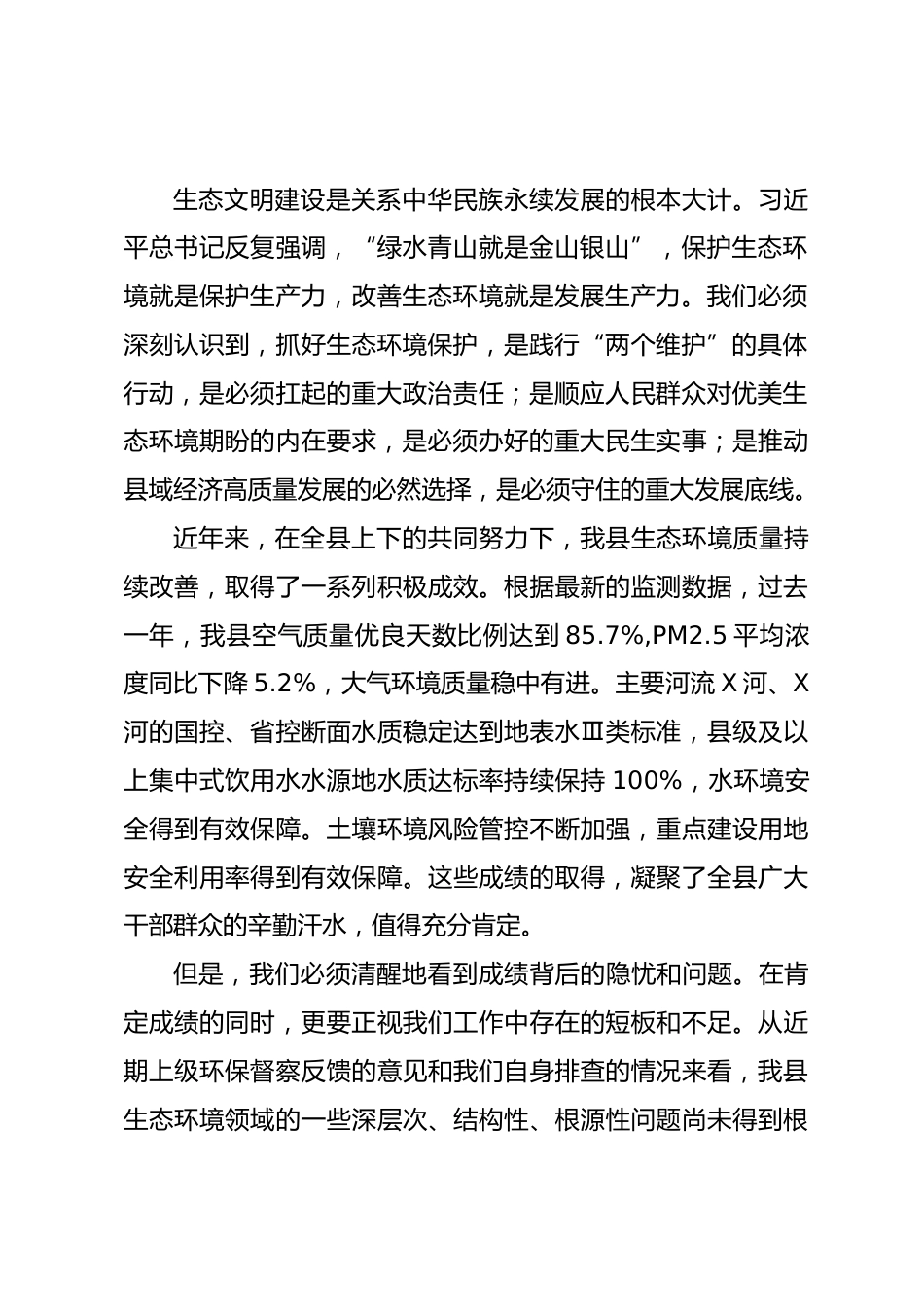 在2025年全縣生態(tài)環(huán)境領(lǐng)域問題排查整治工作專題會議上的講話同志們:今天我們召開全縣生態(tài)環(huán)境領(lǐng)域問題排查整治工作專題會議,主要任務(wù)是深入學(xué)習(xí)貫徹習(xí)近平生態(tài)文明思想,認(rèn)真落實(shí)省委省政府、市委、市政府關(guān)于生態(tài)環(huán)境保護(hù)的最新決策部署,全面分析我縣當(dāng)前面臨的嚴(yán)峻形勢,動員全縣上下進(jìn)一步統(tǒng)一思想、壓實(shí)責(zé)任、強(qiáng)化舉措,以壯士斷腕的決心、背水一戰(zhàn)的勇氣、攻城拔寨的拼勁,堅(jiān)決打贏生態(tài)環(huán)境問題排查整治這場硬仗。剛才,我們聽取了全縣當(dāng)前生態(tài)環(huán)境領(lǐng)域問題排查整治工作的總體情況匯報(bào),X同志、X同志結(jié)合各自單位職責(zé)作了很好的交流發(fā)言,態(tài)度堅(jiān)決、措施具體,體...