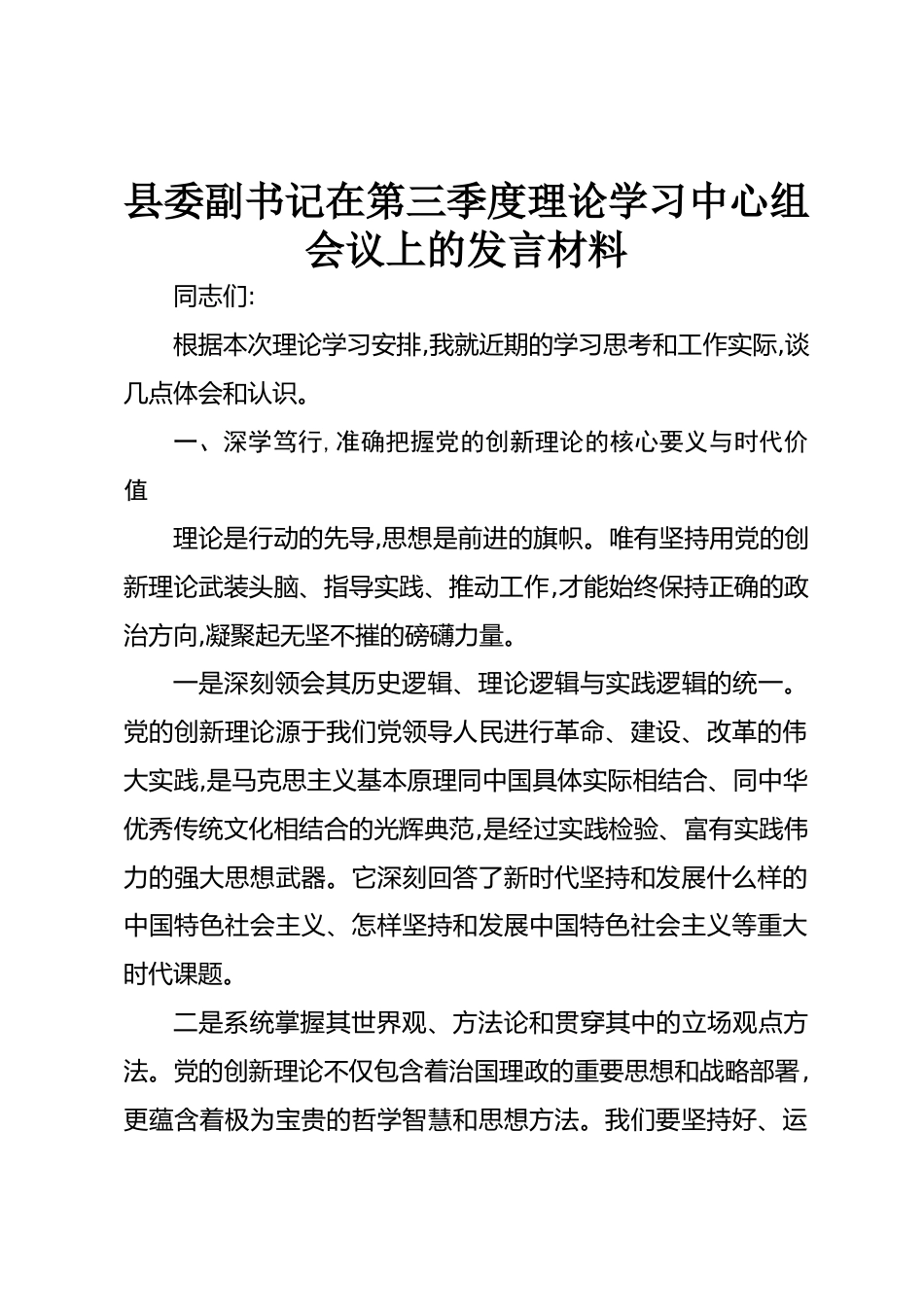 縣委副書記在第三季度理論學(xué)習(xí)中心組會議上的發(fā)言材料同志們:根據(jù)本次理論學(xué)習(xí)安排,我就近期的學(xué)習(xí)思考和工作實(shí)際,談幾點(diǎn)體會和認(rèn)識。一、深學(xué)篤行,準(zhǔn)確把握黨的創(chuàng)新理論的核心要義與時代價值理論是行動的先導(dǎo),思想是前進(jìn)的旗幟。唯有堅(jiān)持用黨的創(chuàng)新理論武裝頭腦、指導(dǎo)實(shí)踐、推動工作,才能始終保持正確的政治方向,凝聚起無堅(jiān)不摧的磅礴力量。一是深刻領(lǐng)會其歷史邏輯、理論邏輯與實(shí)踐邏輯的統(tǒng)一。黨的創(chuàng)新理論源于我們黨領(lǐng)導(dǎo)人民進(jìn)行革命、建設(shè)、改革的偉大實(shí)踐,是馬克思主義基本原理同中國具體實(shí)際相結(jié)合、同中華優(yōu)秀傳統(tǒng)文化相結(jié)合的光輝典范,是經(jīng)過實(shí)踐檢驗(yàn)、富有實(shí)踐...