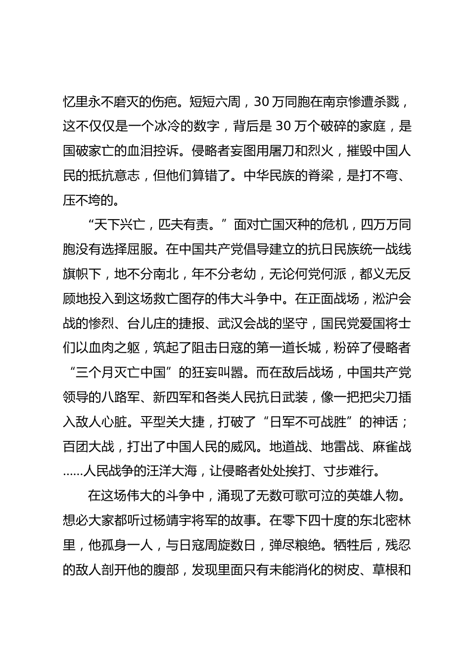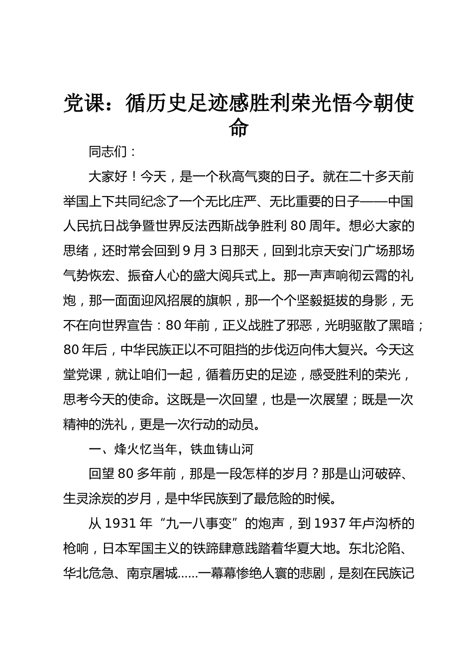 黨課:循歷史足跡感勝利榮光悟今朝使命同志們:大家好!今天,是一個(gè)秋高氣爽的日子。就在二十多天前舉國(guó)上下共同紀(jì)念了一個(gè)無比莊嚴(yán)、無比重要的日子——中國(guó)人民抗日戰(zhàn)爭(zhēng)暨世界反法西斯戰(zhàn)爭(zhēng)勝利80周年。想必大家的思緒,還時(shí)常會(huì)回到9月3日那天,回到北京天安門廣場(chǎng)那場(chǎng)氣勢(shì)恢宏、振奮人心的盛大閱兵式上。那一聲聲響徹云霄的禮炮,那一面面迎風(fēng)招展的旗幟,那一個(gè)個(gè)堅(jiān)毅挺拔的身影,無不在向世界宣告:80年前,正義戰(zhàn)勝了邪惡,光明驅(qū)散了黑暗;80年后,中華民族正以不可阻擋的步伐邁向偉大復(fù)興。今天這堂黨課,就讓咱們一起,循著歷史的足跡,感受勝利的榮光,思考今...