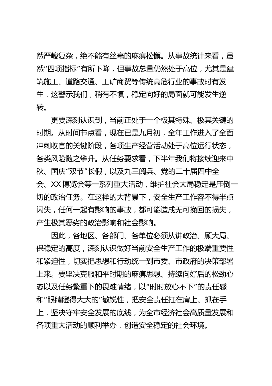 在XX市安全生產(chǎn)工作例會(huì)上的講話同志們:今天召開這次全市安全生產(chǎn)工作例會(huì),主要任務(wù)是深入分析當(dāng)前全市安全生產(chǎn)形勢(shì),總結(jié)今年前八個(gè)月的工作,并對(duì)下一階段,特別是當(dāng)前這個(gè)關(guān)鍵時(shí)期的重點(diǎn)任務(wù)進(jìn)行再動(dòng)員、再部署、再落實(shí)。剛才,與會(huì)人員共同觀看了安全生產(chǎn)事故警示教育片,市應(yīng)急局通報(bào)了1-8月全市安全生產(chǎn)重點(diǎn)工作的推進(jìn)情況,并對(duì)相關(guān)政策和指標(biāo)進(jìn)行了解讀,內(nèi)容都非常重要,希望大家認(rèn)真領(lǐng)會(huì),抓好貫徹執(zhí)行。下面,我再講三點(diǎn)意見。一、正視嚴(yán)峻形勢(shì),時(shí)刻繃緊安全生產(chǎn)這根弦今年以來,在市委、市政府的堅(jiān)強(qiáng)領(lǐng)導(dǎo)下,全市上下認(rèn)真貫徹落實(shí)國(guó)家和省關(guān)于安全生產(chǎn)的...