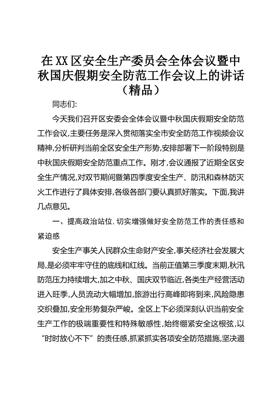 在XX區(qū)安全生產(chǎn)委員會全體會議暨中秋國慶假期安全防范工作會議上的講話(精品)同志們:今天我們召開區(qū)安委會全體會議暨中秋國慶假期安全防范工作會議,主要任務(wù)是深入貫徹落實(shí)全市安全防范工作視頻會議精神,分析研判當(dāng)前全區(qū)安全生產(chǎn)形勢,安排部署下一階段特別是中秋國慶假期安全防范重點(diǎn)工作。剛才,會議通報(bào)了近期全區(qū)安全生產(chǎn)情況,對雙節(jié)期間暨第四季度安全生產(chǎn)、防汛和森林防滅火工作進(jìn)行了具體安排,各級各部門要認(rèn)真抓好落實(shí)。下面,我講幾點(diǎn)意見。一、提高政治站位,切實(shí)增強(qiáng)做好安全防范工作的責(zé)任感和緊迫感安全生產(chǎn)事關(guān)人民群眾生命財(cái)產(chǎn)安全,事關(guān)經(jīng)濟(jì)社會發(fā)展大局,...