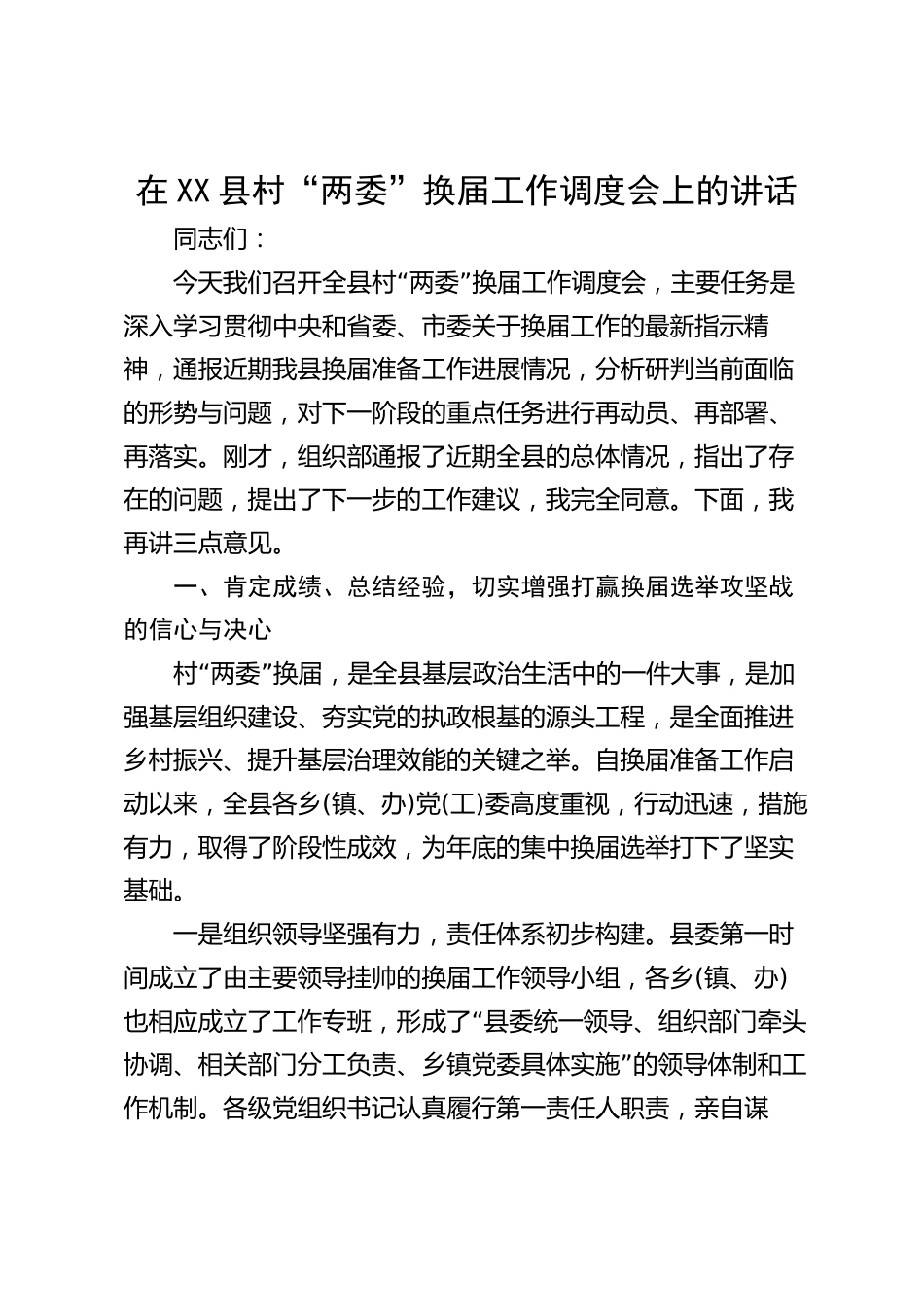 在XX縣村“兩委”換屆工作調(diào)度會(huì)上的講話同志們:“”今天我們召開(kāi)全縣村兩委換屆工作調(diào)度會(huì),主要任務(wù)是深入學(xué)習(xí)貫徹中央和省委、市委關(guān)于換屆工作的最新指示精神,通報(bào)近期我縣換屆準(zhǔn)備工作進(jìn)展情況,分析研判當(dāng)前面臨的形勢(shì)與問(wèn)題,對(duì)下一階段的重點(diǎn)任務(wù)進(jìn)行再動(dòng)員、再部署、再落實(shí)。剛才,組織部通報(bào)了近期全縣的總體情況,指出了存在的問(wèn)題,提出了下一步的工作建議,我完全同意。下面,我再講三點(diǎn)意見(jiàn)。一、肯定成績(jī)、總結(jié)經(jīng)驗(yàn),切實(shí)增強(qiáng)打贏換屆選舉攻堅(jiān)戰(zhàn)的信心與決心“”村兩委換屆,是全縣基層政治生活中的一件大事,是加強(qiáng)基層組織建設(shè)、夯實(shí)黨的執(zhí)政根基的源...