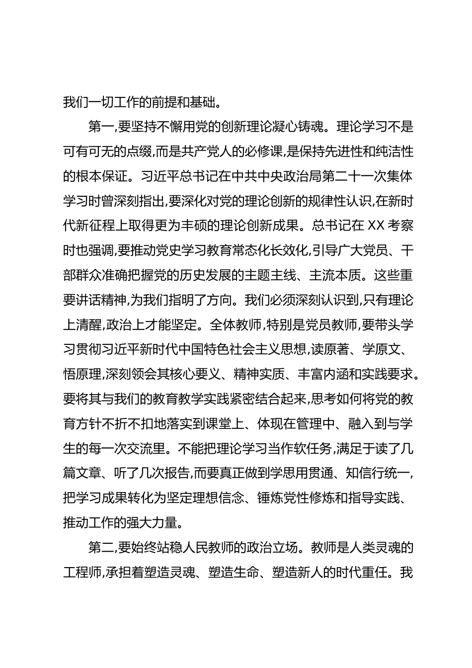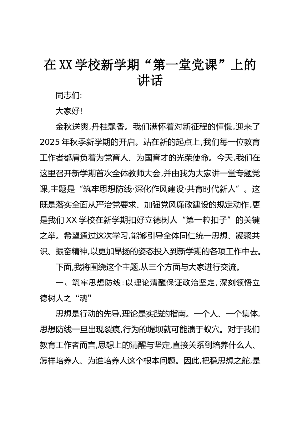 在XX學(xué)校新學(xué)期“第一堂黨課”上的講話同志們:大家好!金秋送爽,丹桂飄香。我們滿懷著對(duì)新征程的憧憬,迎來(lái)了2025年秋季新學(xué)期的開(kāi)啟。站在新的起點(diǎn)上,我們每一位教育工作者都肩負(fù)著為黨育人、為國(guó)育才的光榮使命。今天,我們?cè)谶@里召開(kāi)新學(xué)期首次全體教師大會(huì),并由我為大家講一堂專題黨課,主題是“筑牢思想防線·深化作風(fēng)建設(shè)·共育時(shí)代新人”。這既是落實(shí)全面從嚴(yán)治黨要求、加強(qiáng)黨風(fēng)廉政建設(shè)的規(guī)定動(dòng)作,更是我們XX學(xué)校在新學(xué)期扣好立德樹人“第一粒扣子”的關(guān)鍵之舉。希望通過(guò)這次學(xué)習(xí),能夠引導(dǎo)全體同仁統(tǒng)一思想、凝聚共識(shí)、振奮精神,以更加昂揚(yáng)的姿態(tài)投入到新學(xué)期的各項(xiàng)...