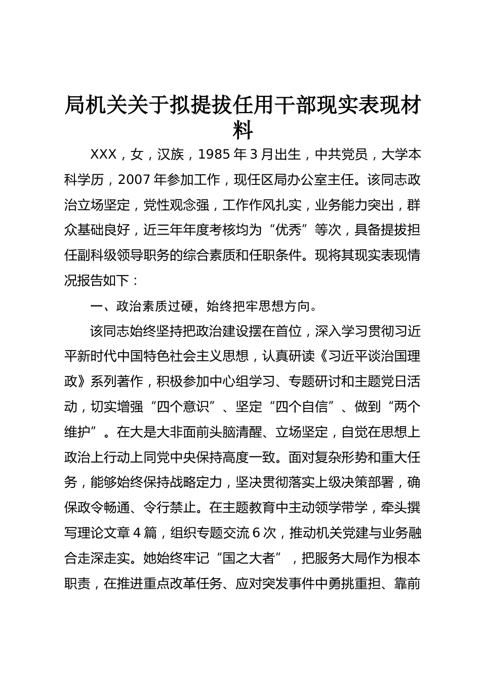 局機關(guān)關(guān)于擬提拔任用干部現(xiàn)實表現(xiàn)材料XXX,女,漢族,1985年3月出生,中共黨員,大學本科學歷,2007年參加工作,現(xiàn)任區(qū)局辦公室主任。該同志政治立場堅定,黨性觀念強,工作作風扎實,業(yè)務能力突出,群眾基礎良好,近三年年度考核均為“優(yōu)秀”等次,具備提拔擔任副科級領導職務的綜合素質(zhì)和任職條件?,F(xiàn)將其現(xiàn)實表現(xiàn)情況報告如下:一、政治素質(zhì)過硬,始終把牢思想方向。該同志始終堅持把政治建設擺在首位,深入學習貫徹習近平新時代中國特色社會主義思想,認真研讀《習近平談治國理政》系列著作,積極參加中心組學習、專題研討和主題黨日活動,切實增強“四個意識”、堅...