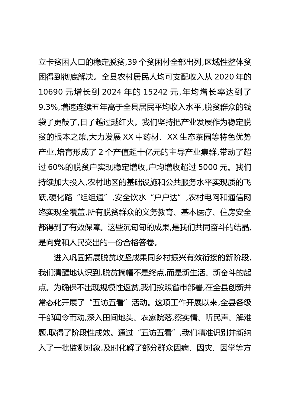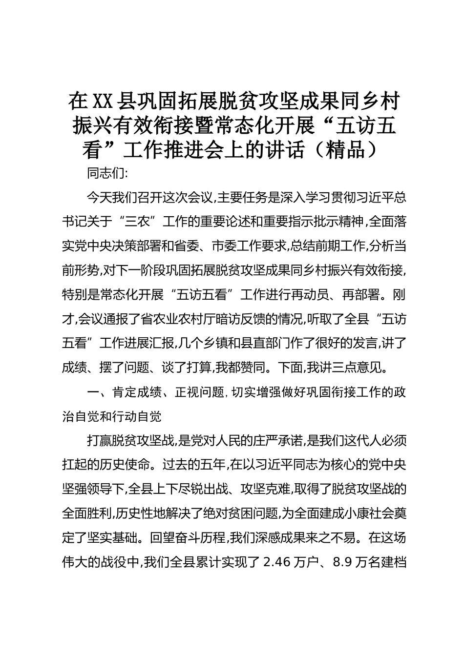 在XX縣鞏固拓展脫貧攻堅(jiān)成果同鄉(xiāng)村振興有效銜接暨常態(tài)化開(kāi)展“五訪(fǎng)五看”工作推進(jìn)會(huì)上的講話(huà)(精品)同志們:今天我們召開(kāi)這次會(huì)議,主要任務(wù)是深入學(xué)習(xí)貫徹習(xí)近平總書(shū)記關(guān)于“三農(nóng)”工作的重要論述和重要指示批示精神,全面落實(shí)黨中央決策部署和省委、市委工作要求,總結(jié)前期工作,分析當(dāng)前形勢(shì),對(duì)下一階段鞏固拓展脫貧攻堅(jiān)成果同鄉(xiāng)村振興有效銜接,特別是常態(tài)化開(kāi)展“五訪(fǎng)五看”工作進(jìn)行再動(dòng)員、再部署。剛才,會(huì)議通報(bào)了省農(nóng)業(yè)農(nóng)村廳暗訪(fǎng)反饋的情況,聽(tīng)取了全縣“五訪(fǎng)五看”工作進(jìn)展匯報(bào),幾個(gè)鄉(xiāng)鎮(zhèn)和縣直部門(mén)作了很好的發(fā)言,講了成績(jī)、擺了問(wèn)題、談了打算,我都贊同。下面,我講...