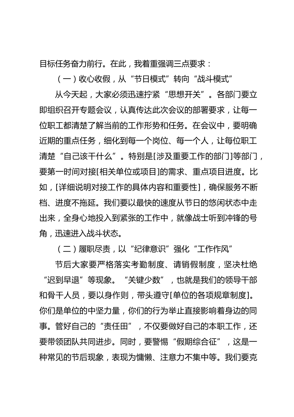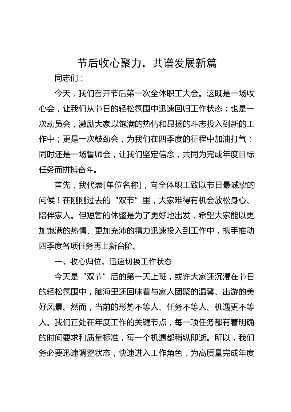 節(jié)后收心聚力,共譜發(fā)展新篇同志們:今天,我們召開節(jié)后第一次全體職工大會。這既是一場收心會,讓我們從節(jié)日的輕松氛圍中迅速回歸工作狀態(tài);也是一次動員會,激勵大家以飽滿的熱情和昂揚(yáng)的斗志投入到新的工作中;更是一次鼓勁會,為我們在四季度的征程中加油打氣;同時還是一場誓師會,讓我們堅定信念,共同為完成年度目標(biāo)任務(wù)而拼搏奮斗。首先,我代表[單位名稱],向全體職工致以節(jié)日最誠摯的問候!在剛剛過去的“雙節(jié)”里,大家難得有機(jī)會放松身心、陪伴家人。但短暫的休整是為了更好地出發(fā),希望大家能以更加飽滿的熱情、更加充沛的精力迅速投入到工作中,攜手推動四...