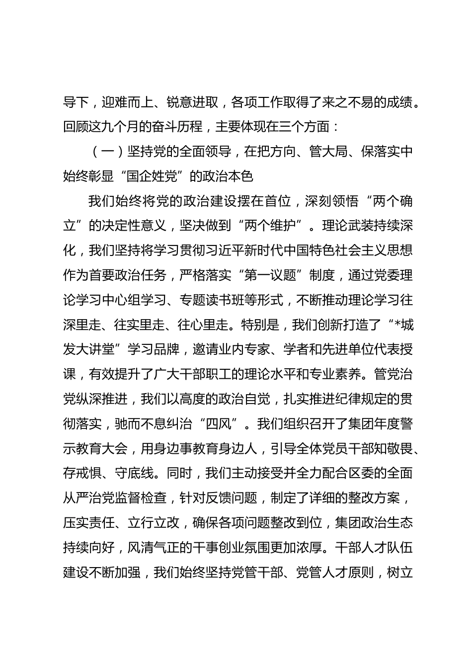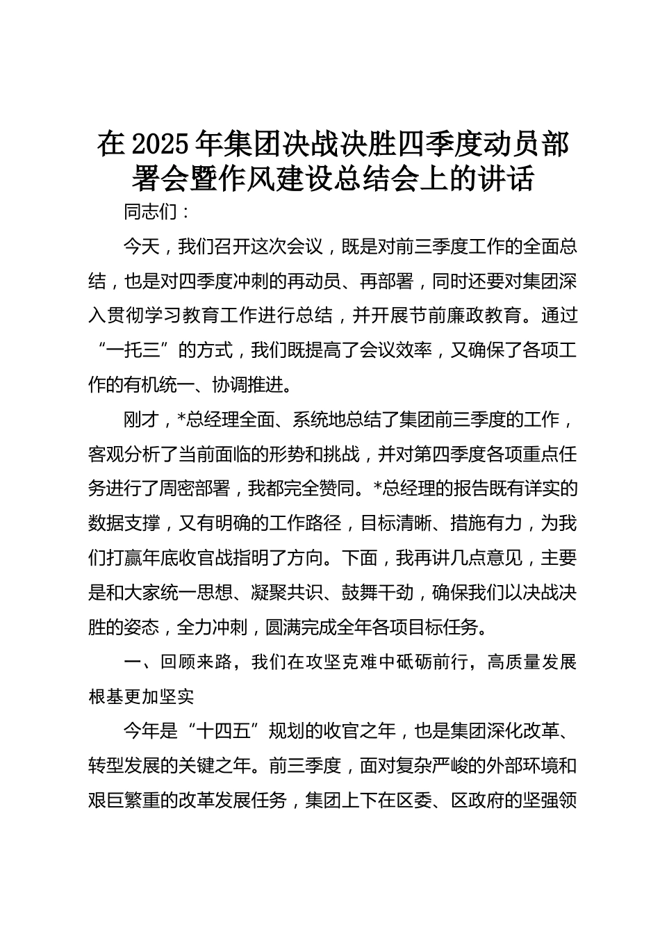 在2025年集團(tuán)決戰(zhàn)決勝四季度動員部署會暨作風(fēng)建設(shè)總結(jié)會上的講話同志們:今天,我們召開這次會議,既是對前三季度工作的全面總結(jié),也是對四季度沖刺的再動員、再部署,同時還要對集團(tuán)深入貫徹學(xué)習(xí)教育工作進(jìn)行總結(jié),并開展節(jié)前廉政教育。通過“一托三”的方式,我們既提高了會議效率,又確保了各項(xiàng)工作的有機(jī)統(tǒng)一、協(xié)調(diào)推進(jìn)。剛才,*總經(jīng)理全面、系統(tǒng)地總結(jié)了集團(tuán)前三季度的工作,客觀分析了當(dāng)前面臨的形勢和挑戰(zhàn),并對第四季度各項(xiàng)重點(diǎn)任務(wù)進(jìn)行了周密部署,我都完全贊同。*總經(jīng)理的報(bào)告既有詳實(shí)的數(shù)據(jù)支撐,又有明確的工作路徑,目標(biāo)清晰、措施有力,為我們打贏年底收官...