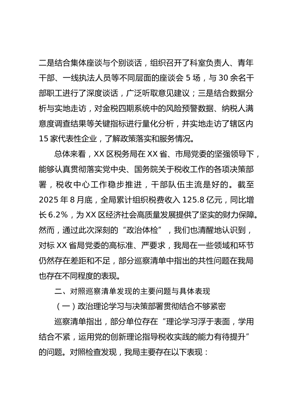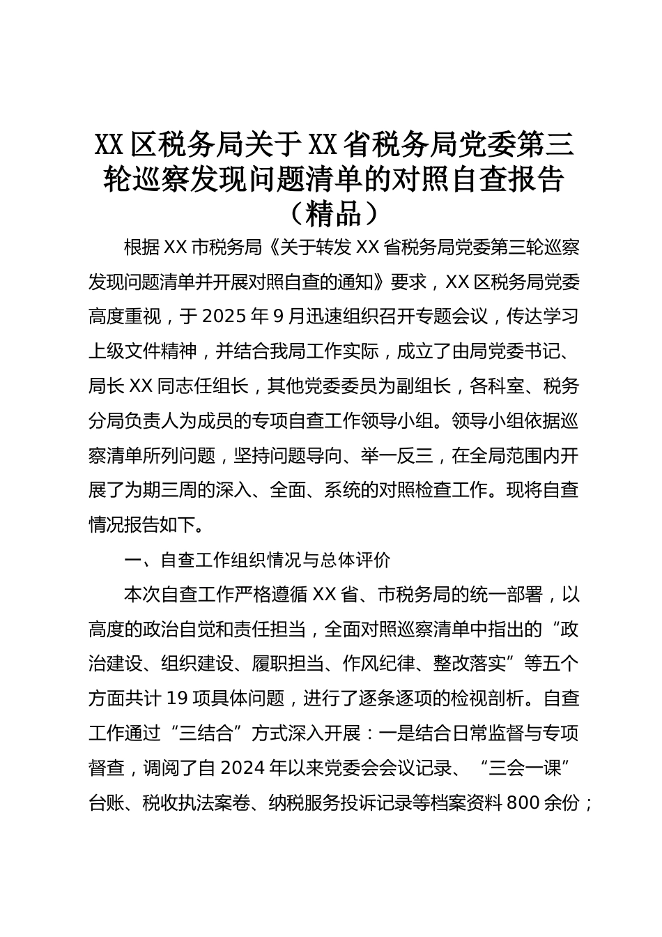 XX區(qū)稅務(wù)局關(guān)于XX省稅務(wù)局黨委第三輪巡察發(fā)現(xiàn)問題清單的對照自查報(bào)告(精品)根據(jù)XX市稅務(wù)局《關(guān)于轉(zhuǎn)發(fā)XX省稅務(wù)局黨委第三輪巡察發(fā)現(xiàn)問題清單并開展對照自查的通知》要求,XX區(qū)稅務(wù)局黨委高度重視,于2025年9月迅速組織召開專題會(huì)議,傳達(dá)學(xué)習(xí)上級文件精神,并結(jié)合我局工作實(shí)際,成立了由局黨委書記、局長XX同志任組長,其他黨委委員為副組長,各科室、稅務(wù)分局負(fù)責(zé)人為成員的專項(xiàng)自查工作領(lǐng)導(dǎo)小組。領(lǐng)導(dǎo)小組依據(jù)巡察清單所列問題,堅(jiān)持問題導(dǎo)向、舉一反三,在全局范圍內(nèi)開展了為期三周的深入、全面、系統(tǒng)的對照檢查工作?,F(xiàn)將自查情況報(bào)告如下。一、自查工作組織情況與...