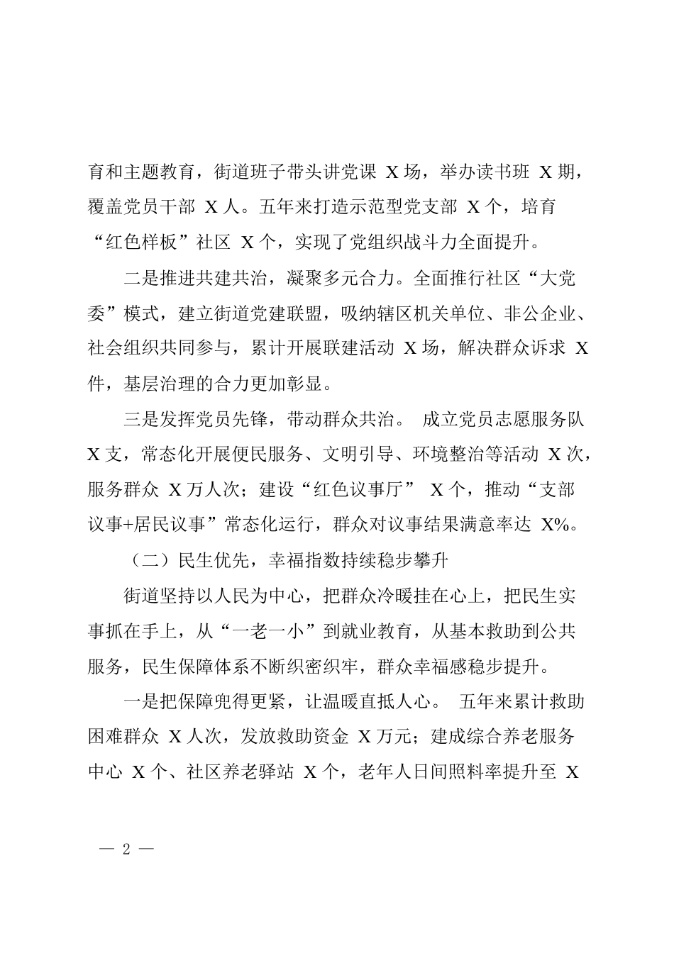 街道“十四五”期間工作完成情況和“十五五”期間工作安排“十四五”時期,是街道乘勢而上、奮楫爭先的五年。五年來,在市委、市政府和區(qū)委、區(qū)政府的堅強領(lǐng)導(dǎo)下,街道堅持以習(xí)近平新時代中國特色社會主義思想為指引,緊扣“黨建統(tǒng)領(lǐng)、民生為本、治理提效、環(huán)境提質(zhì)”的總體思路,聚焦城市更新、服務(wù)提升、基層治理、生態(tài)改善等重點任務(wù),推動經(jīng)濟社會發(fā)展和民生事業(yè)齊頭并進,譜寫了人民滿意、街區(qū)靚麗、治理高效的嶄新篇章?,F(xiàn)將“十四五”時期工作總結(jié)及“十五五”規(guī)劃思路匯報如下:一、“十四五”期間工作完成情況(一)黨建統(tǒng)領(lǐng),基層治理更加堅強有力五年來,街道...