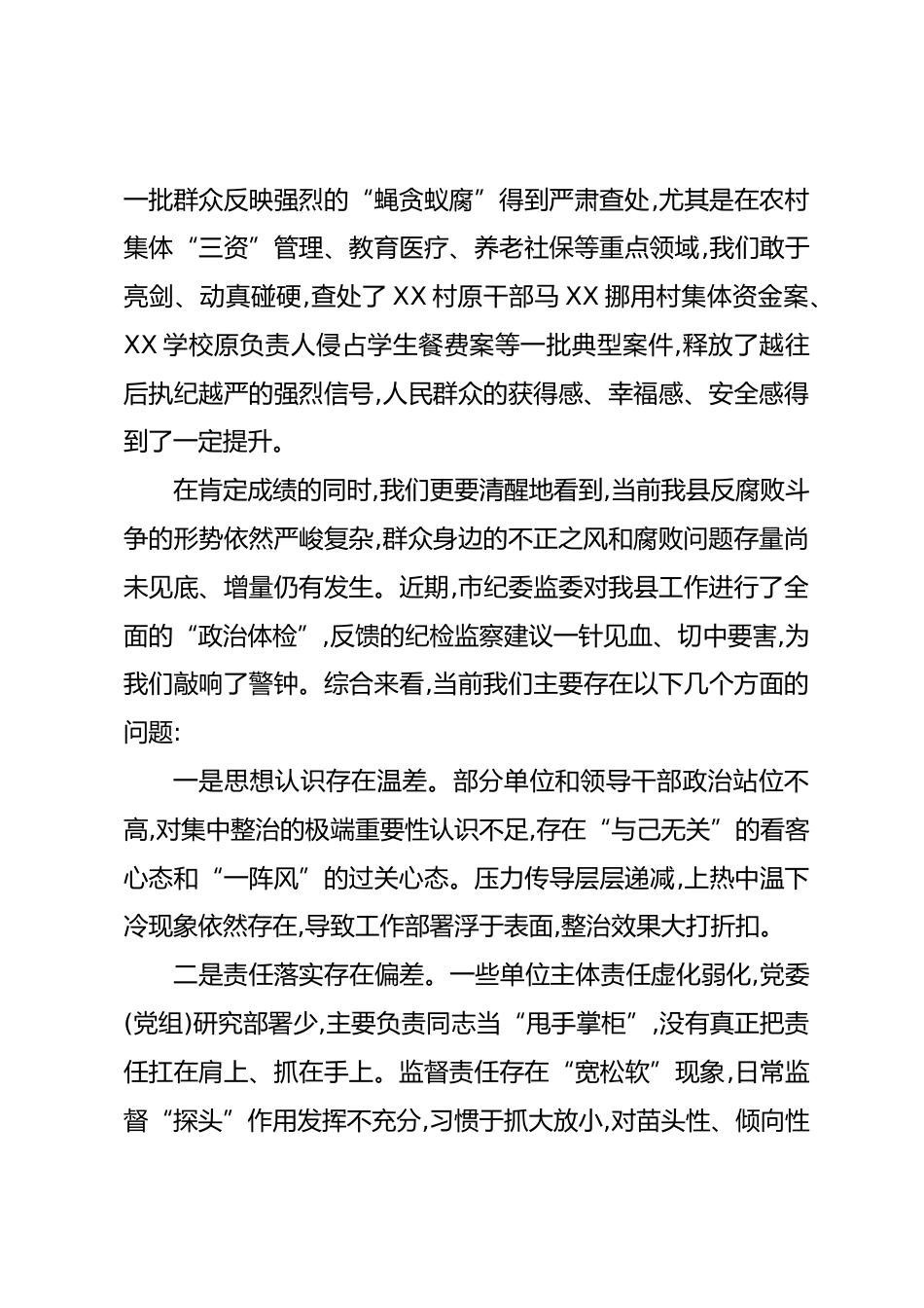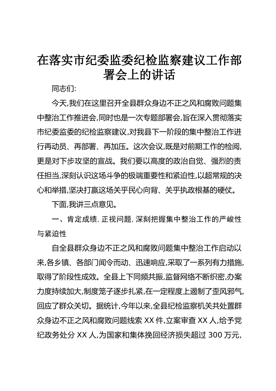 在落實(shí)市紀(jì)委監(jiān)委紀(jì)檢監(jiān)察建議工作部署會(huì)上的講話同志們:今天,我們?cè)谶@里召開(kāi)全縣群眾身邊不正之風(fēng)和腐敗問(wèn)題集中整治工作推進(jìn)會(huì),同時(shí)也是一次專題部署會(huì),旨在深入貫徹落實(shí)市紀(jì)委監(jiān)委的紀(jì)檢監(jiān)察建議,對(duì)我縣下一階段的集中整治工作進(jìn)行再動(dòng)員、再部署、再加壓。這次會(huì)議,既是對(duì)前期工作的檢閱,更是對(duì)下步攻堅(jiān)的宣戰(zhàn)。我們要以高度的政治自覺(jué)、強(qiáng)烈的責(zé)任擔(dān)當(dāng),深刻認(rèn)識(shí)這場(chǎng)斗爭(zhēng)的極端重要性和緊迫性,以超常規(guī)的決心和舉措,堅(jiān)決打贏這場(chǎng)關(guān)乎民心向背、關(guān)乎執(zhí)政根基的硬仗。下面,我講三點(diǎn)意見(jiàn)。一、肯定成績(jī),正視問(wèn)題,深刻把握集中整治工作的嚴(yán)峻性與緊迫性自全縣群眾身邊不...