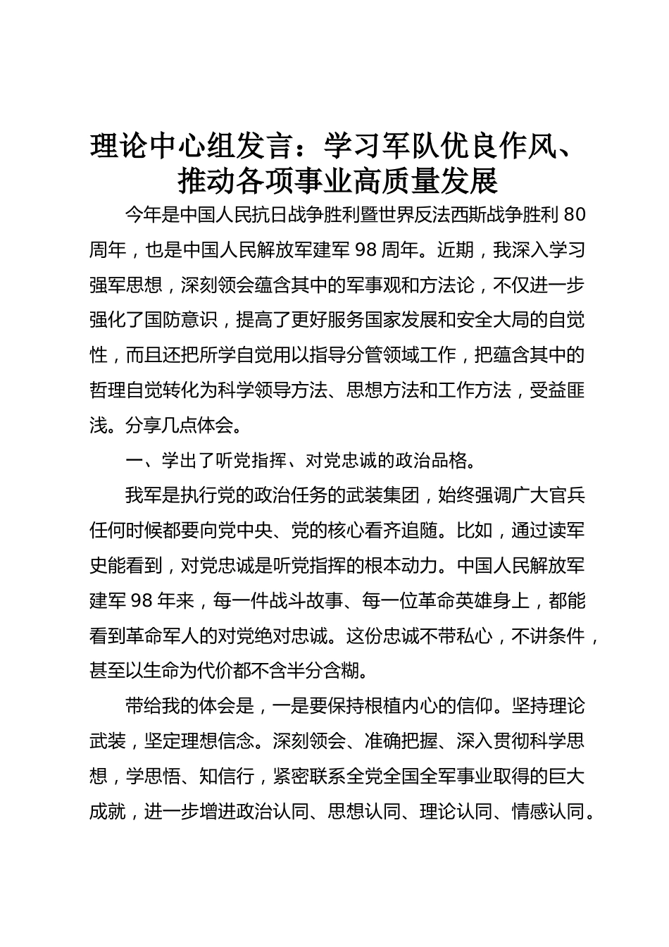 理論中心組發(fā)言:學習軍隊優(yōu)良作風、推動各項事業(yè)高質量發(fā)展今年是中國人民抗日戰(zhàn)爭勝利暨世界反法西斯戰(zhàn)爭勝利80周年,也是中國人民解放軍建軍98周年。近期,我深入學習強軍思想,深刻領會蘊含其中的軍事觀和方法論,不僅進一步強化了國防意識,提高了更好服務國家發(fā)展和安全大局的自覺性,而且還把所學自覺用以指導分管領域工作,把蘊含其中的哲理自覺轉化為科學領導方法、思想方法和工作方法,受益匪淺。分享幾點體會。一、學出了聽黨指揮、對黨忠誠的政治品格。我軍是執(zhí)行黨的政治任務的武裝集團,始終強調廣大官兵任何時候都要向黨中央、黨的核心看齊追隨。比如,通...