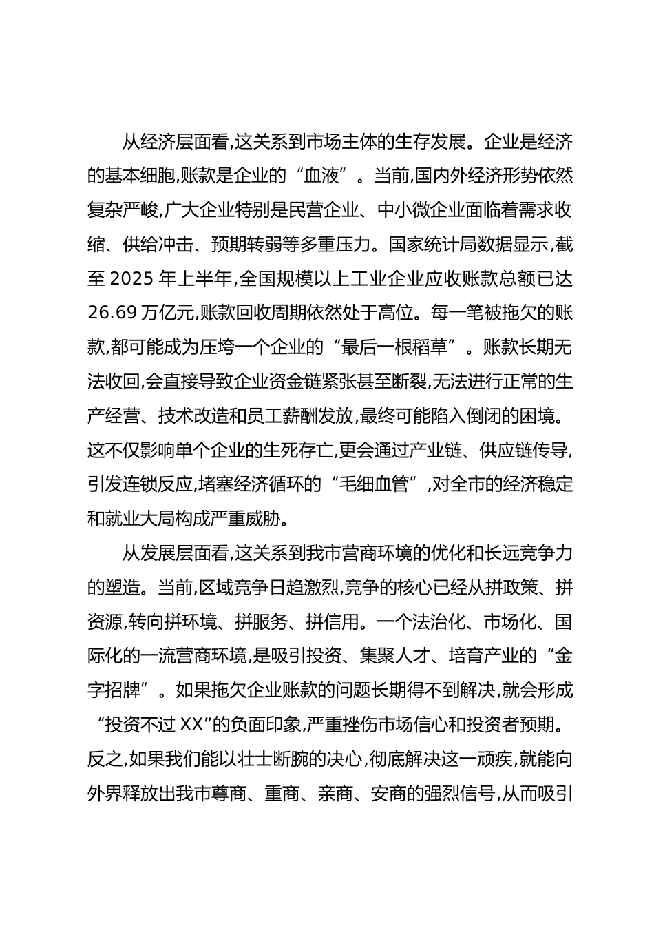 在XX市清理拖欠企業(yè)賬款工作推進(jìn)會(huì)議上的講話同志們:今天,我們召開這次全市清理拖欠企業(yè)賬款工作推進(jìn)會(huì)議,主要任務(wù)是深入貫徹落實(shí)黨中央、國(guó)務(wù)院和省委、省政府關(guān)于清理拖欠企業(yè)賬款工作的系列決策部署,深入學(xué)習(xí)領(lǐng)會(huì)習(xí)近平總書記近期重要講話精神,對(duì)我市前一階段的工作進(jìn)行總結(jié),對(duì)當(dāng)前面臨的形勢(shì)進(jìn)行分析,對(duì)下一步的攻堅(jiān)任務(wù)進(jìn)行再動(dòng)員、再部署。剛才,相關(guān)部門匯報(bào)了工作進(jìn)展情況,也剖析了存在的堵點(diǎn)難點(diǎn)問題,講得都很好,很客觀。下面,我講幾點(diǎn)意見。一、提高政治站位,深刻認(rèn)識(shí)清欠工作的極端重要性與緊迫性清理拖欠企業(yè)賬款,是一項(xiàng)嚴(yán)肅的政治任務(wù),也是一道必須回答好的...