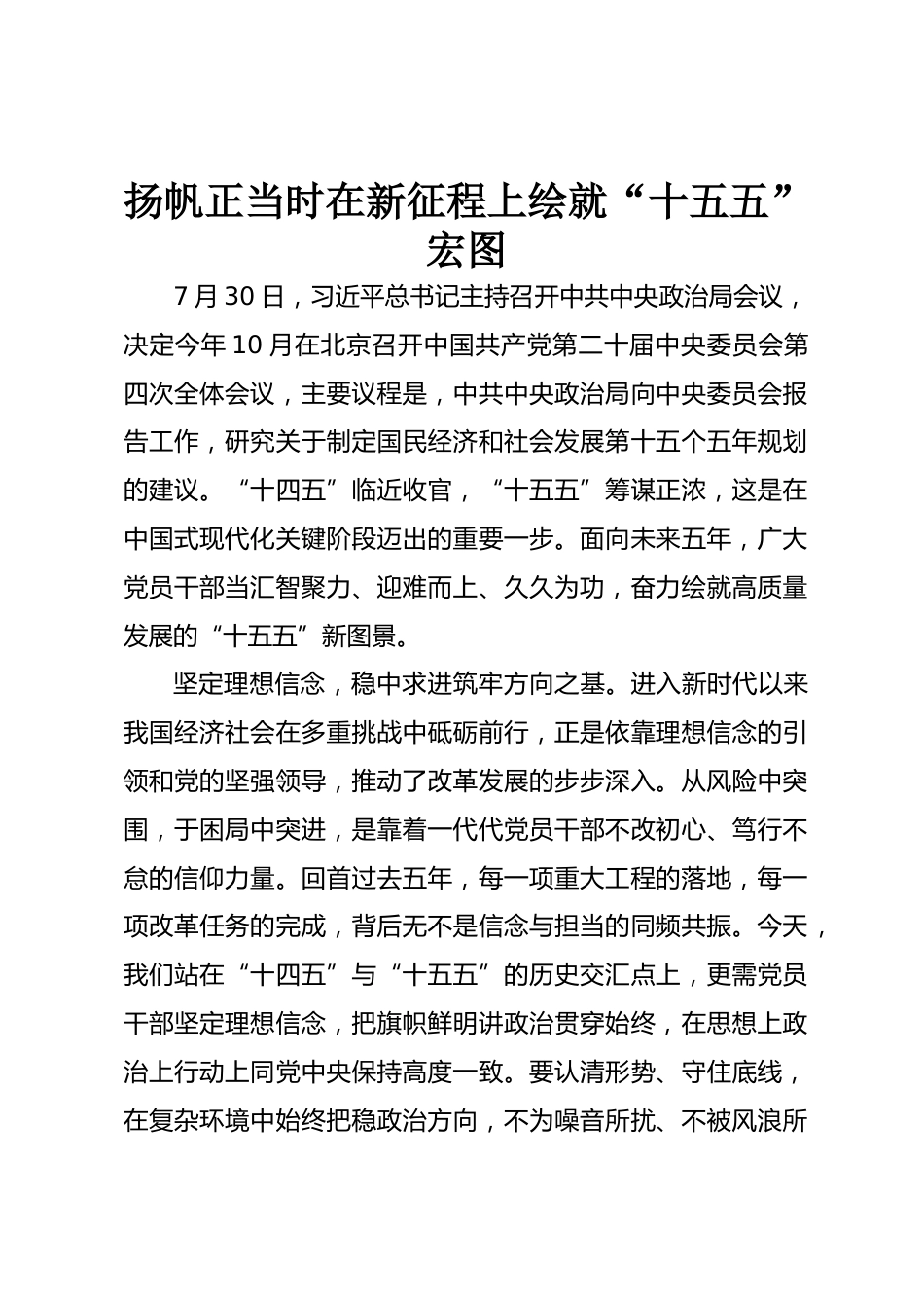 揚(yáng)帆正當(dāng)時(shí)在新征程上繪就“十五五”宏圖7月30日,習(xí)近平總書記主持召開中共中央政治局會議,決定今年10月在北京召開中國共產(chǎn)黨第二十屆中央委員會第四次全體會議,主要議程是,中共中央政治局向中央委員會報(bào)告工作,研究關(guān)于制定國民經(jīng)濟(jì)和社會發(fā)展第十五個(gè)五年規(guī)劃的建議。“十四五”臨近收官,“十五五”籌謀正濃,這是在中國式現(xiàn)代化關(guān)鍵階段邁出的重要一步。面向未來五年,廣大黨員干部當(dāng)匯智聚力、迎難而上、久久為功,奮力繪就高質(zhì)量發(fā)展的“十五五”新圖景。堅(jiān)定理想信念,穩(wěn)中求進(jìn)筑牢方向之基。進(jìn)入新時(shí)代以來我國經(jīng)濟(jì)社會在多重挑戰(zhàn)中砥礪前行,正是依靠理想...