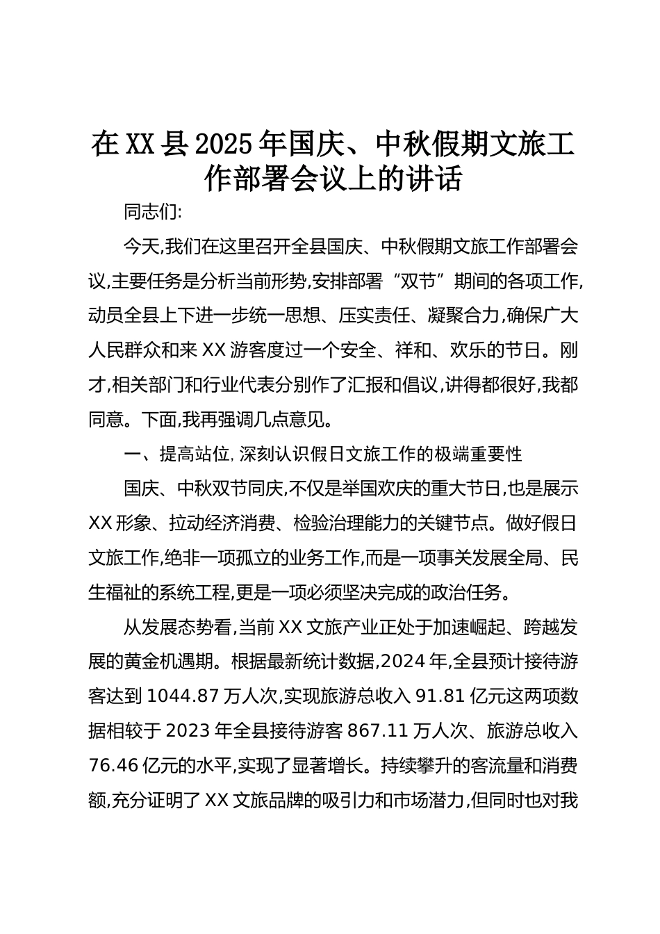在XX縣2025年國慶、中秋假期文旅工作部署會議上的講話