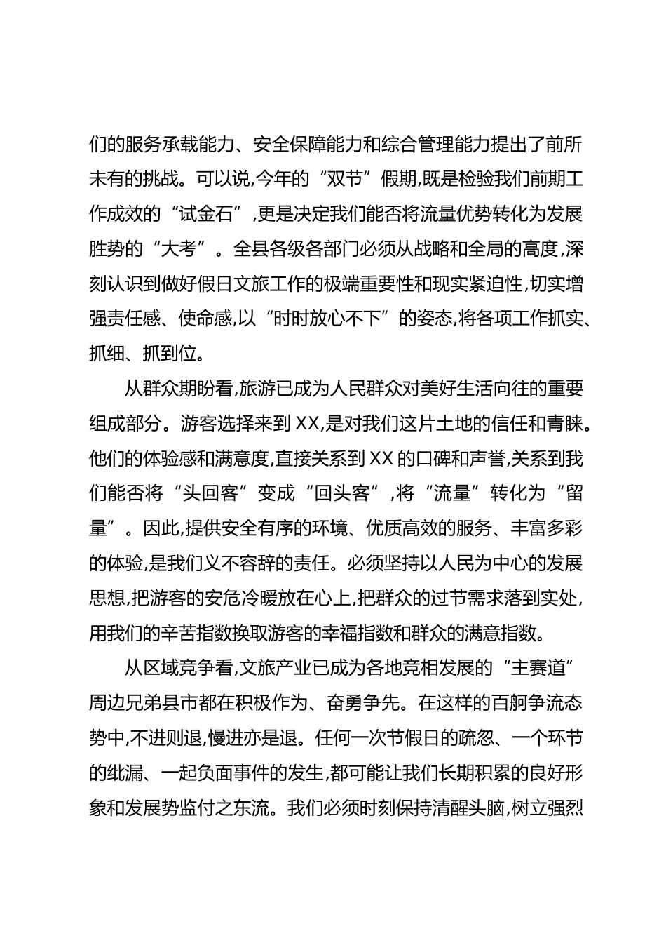 在XX縣2025年國慶、中秋假期文旅工作部署會議上的講話同志們:今天,我們在這里召開全縣國慶、中秋假期文旅工作部署會議,主要任務(wù)是分析當(dāng)前形勢,安排部署“雙節(jié)”期間的各項工作,動員全縣上下進一步統(tǒng)一思想、壓實責(zé)任、凝聚合力,確保廣大人民群眾和來XX游客度過一個安全、祥和、歡樂的節(jié)日。剛才,相關(guān)部門和行業(yè)代表分別作了匯報和倡議,講得都很好,我都同意。下面,我再強調(diào)幾點意見。一、提高站位,深刻認識假日文旅工作的極端重要性國慶、中秋雙節(jié)同慶,不僅是舉國歡慶的重大節(jié)日,也是展示XX形象、拉動經(jīng)濟消費、檢驗治理能力的關(guān)鍵節(jié)點。做好假日文旅工作,絕非一項孤立的...