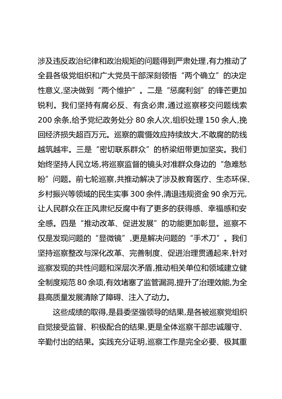 在XX縣委十七屆八輪巡察動員部署會上的講話(精品)同志們:今天我們召開會議,主要任務(wù)是深入學(xué)習(xí)貫徹習(xí)近平總書記關(guān)于巡視工作的重要論述,全面落實(shí)黨中央和省委、市委關(guān)于巡視巡察工作的新部署新要求,對十七屆縣委第八輪巡察工作進(jìn)行動員部署。剛才,XX同志宣讀了本輪巡察的授權(quán)任職及任務(wù)分工決定,這標(biāo)志著我縣新一輪巡察工作的戰(zhàn)鼓已經(jīng)擂響。下面,我講三點(diǎn)意見。一、總結(jié)過往,堅(jiān)定信心,深刻認(rèn)識巡察工作的重大成就與時代價值巡視巡察是黨之利器、國之利器,是黨進(jìn)行自我革命、深入推進(jìn)全面從嚴(yán)治黨的戰(zhàn)略性制度安排。自本屆縣委以來,我們始終將巡察工作擺在管黨治黨、治...
