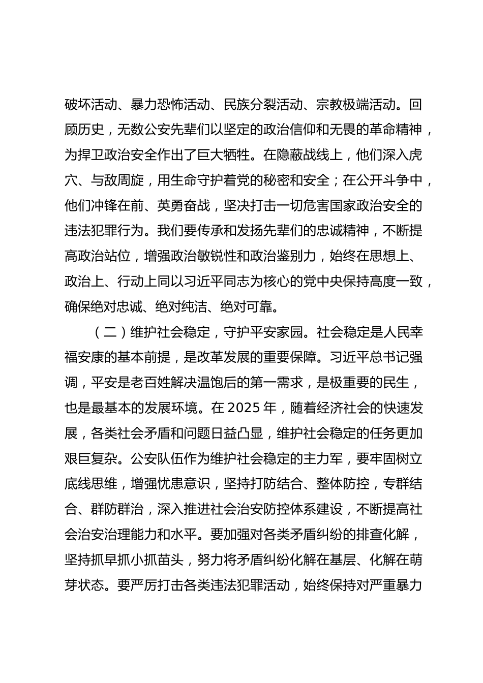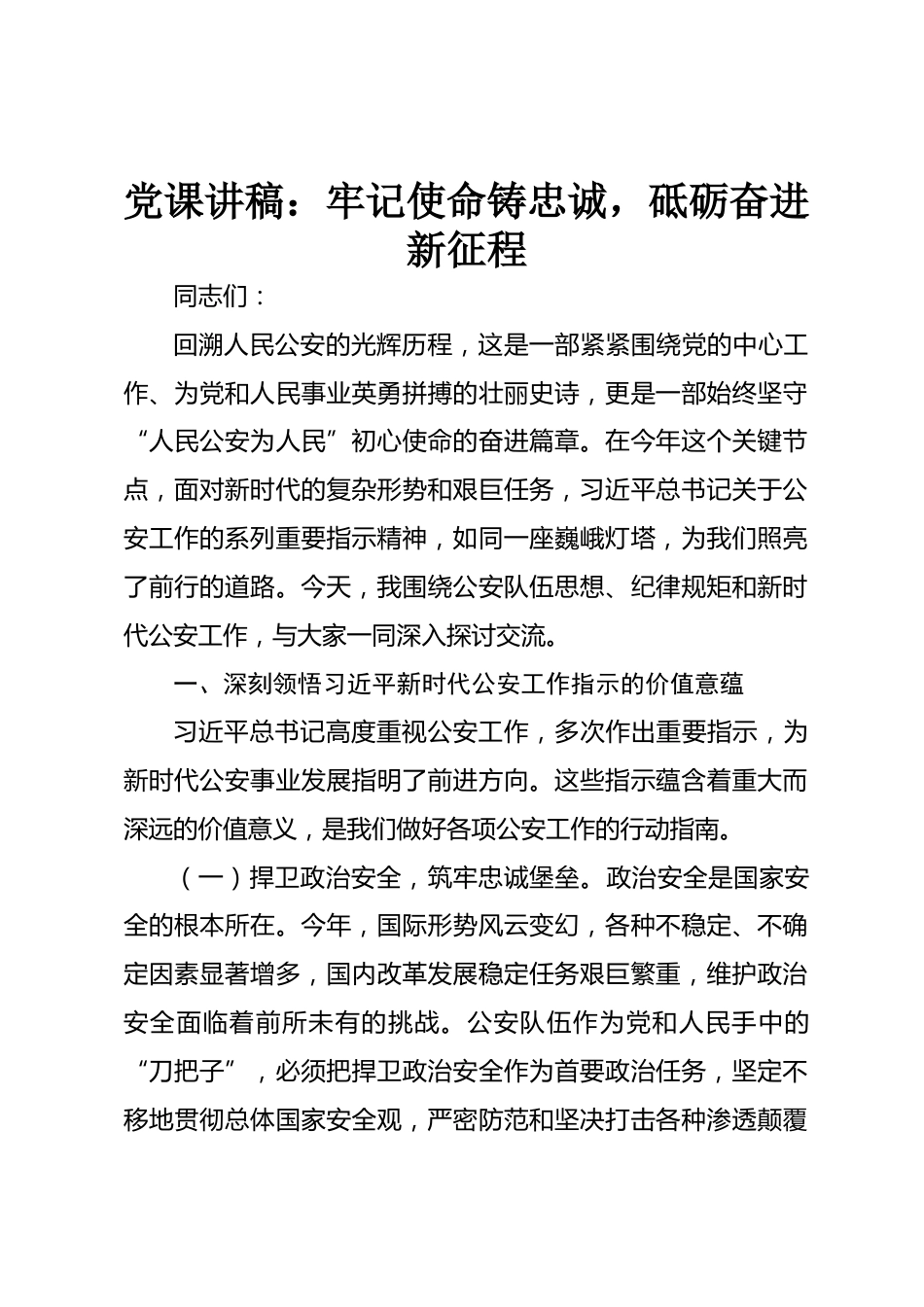 黨課講稿:牢記使命鑄忠誠,砥礪奮進新征程同志們:回溯人民公安的光輝歷程,這是一部緊緊圍繞黨的中心工作、為黨和人民事業(yè)英勇拼搏的壯麗史詩,更是一部始終堅守“人民公安為人民”初心使命的奮進篇章。在今年這個關(guān)鍵節(jié)點,面對新時代的復(fù)雜形勢和艱巨任務(wù),習(xí)近平總書記關(guān)于公安工作的系列重要指示精神,如同一座巍峨燈塔,為我們照亮了前行的道路。今天,我圍繞公安隊伍思想、紀(jì)律規(guī)矩和新時代公安工作,與大家一同深入探討交流。一、深刻領(lǐng)悟習(xí)近平新時代公安工作指示的價值意蘊習(xí)近平總書記高度重視公安工作,多次作出重要指示,為新時代公安事業(yè)發(fā)展指明了前進方...