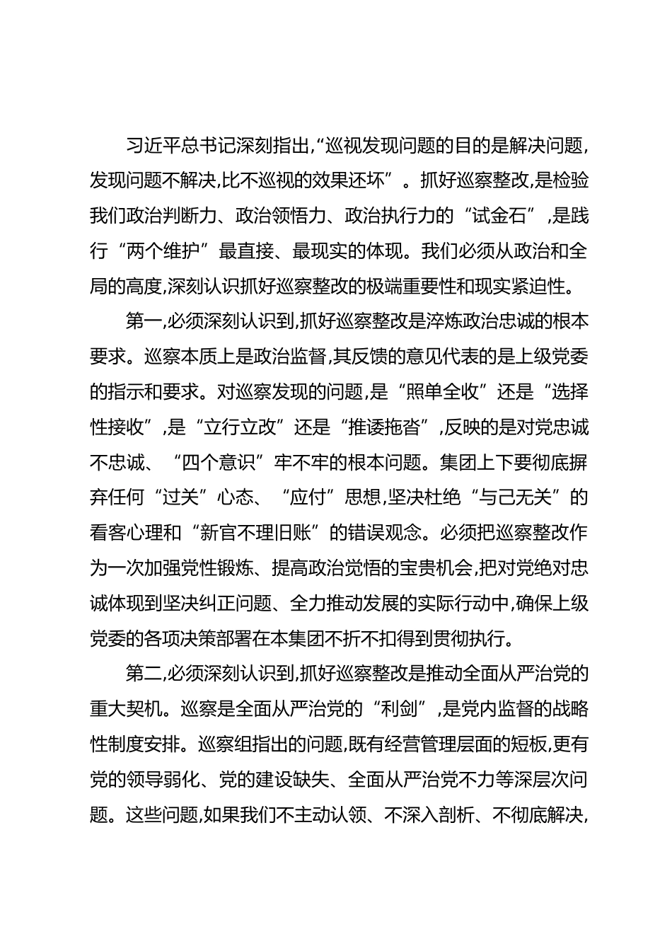在XX集團(tuán)落實(shí)上級集團(tuán)黨委巡察反饋意見整改工作專題黨委會上的講話同志們:今天,我們召開集團(tuán)黨委專題會議,主要任務(wù)是深入學(xué)習(xí)貫徹習(xí)近平總書記關(guān)于巡視工作的重要論述,全面部署落實(shí)上級集團(tuán)黨委第二巡察組巡察反饋意見的整改工作。剛才,XX同志傳達(dá)了巡察反饋的意見,XX同志就做好整改工作提出了明確的紀(jì)律要求,我都完全同意。這次巡察,是對本集團(tuán)黨委的一次全面“政治體檢”,也是一次深刻的“黨性洗禮”。巡察組指出的問題,客觀中肯、切中要害;提出的整改意見,精準(zhǔn)深刻、對癥下藥。這充分體現(xiàn)了上級集團(tuán)黨委對我們的嚴(yán)管與厚愛,是對我們集團(tuán)持續(xù)健康發(fā)展的有力鞭策和重要...