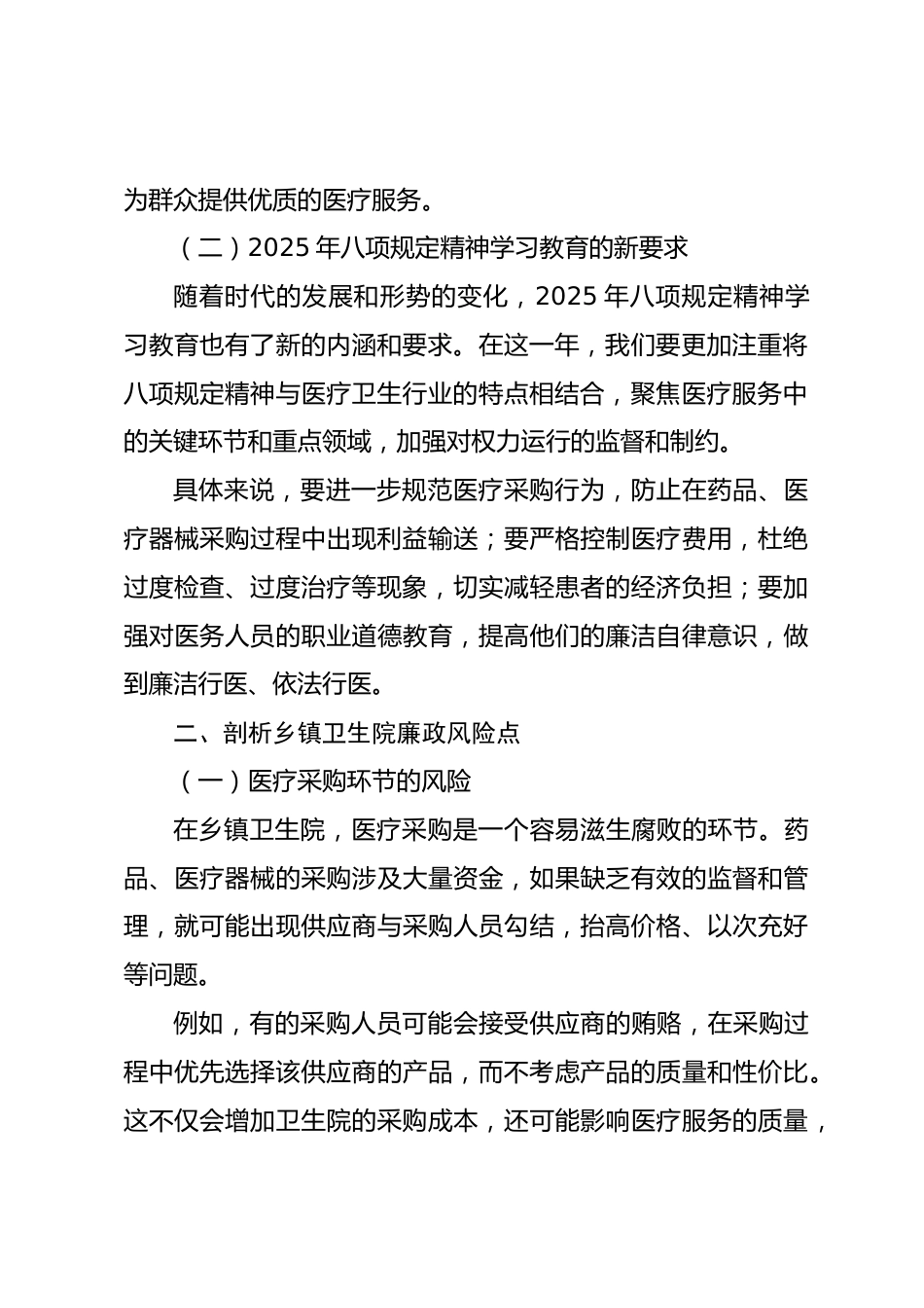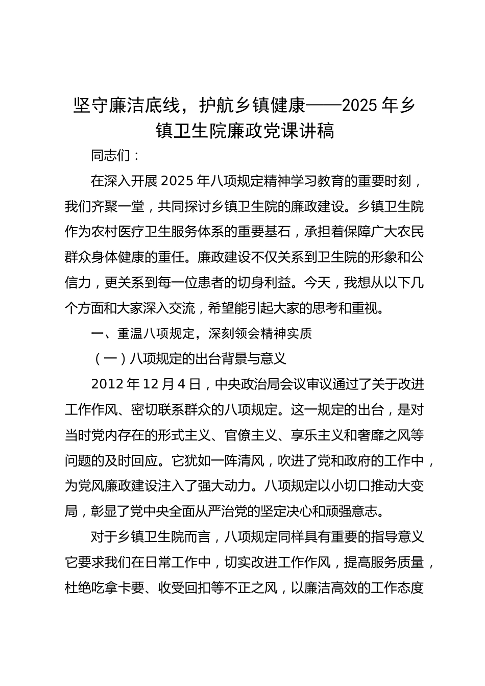 堅(jiān)守廉潔底線,護(hù)航鄉(xiāng)鎮(zhèn)健康——2025年鄉(xiāng)鎮(zhèn)衛(wèi)生院廉政黨課講稿同志們:在深入開展2025年八項(xiàng)規(guī)定精神學(xué)習(xí)教育的重要時(shí)刻,我們齊聚一堂,共同探討鄉(xiāng)鎮(zhèn)衛(wèi)生院的廉政建設(shè)。鄉(xiāng)鎮(zhèn)衛(wèi)生院作為農(nóng)村醫(yī)療衛(wèi)生服務(wù)體系的重要基石,承擔(dān)著保障廣大農(nóng)民群眾身體健康的重任。廉政建設(shè)不僅關(guān)系到衛(wèi)生院的形象和公信力,更關(guān)系到每一位患者的切身利益。今天,我想從以下幾個(gè)方面和大家深入交流,希望能引起大家的思考和重視。一、重溫八項(xiàng)規(guī)定,深刻領(lǐng)會(huì)精神實(shí)質(zhì)(一)八項(xiàng)規(guī)定的出臺(tái)背景與意義2012年12月4日,中央政治局會(huì)議審議通過(guò)了關(guān)于改進(jìn)工作作風(fēng)、密切聯(lián)系群眾的八項(xiàng)規(guī)定。這一...