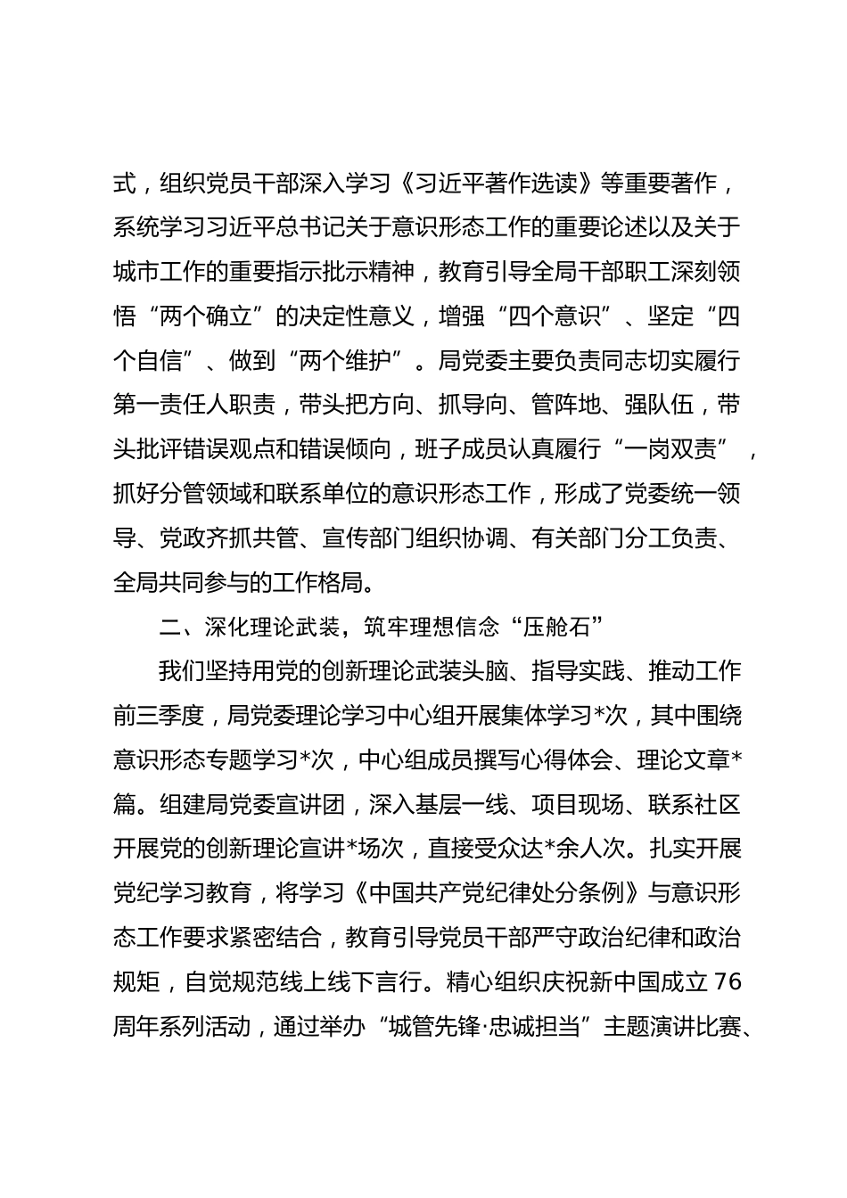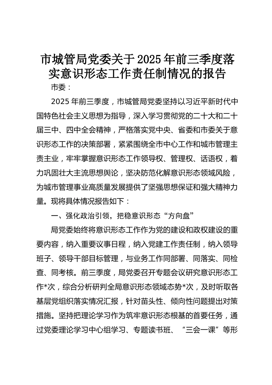 市城管局黨委關(guān)于2025年前三季度落實(shí)意識(shí)形態(tài)工作責(zé)任制情況的報(bào)告市委:2025年前三季度,市城管局黨委堅(jiān)持以習(xí)近平新時(shí)代中國(guó)特色社會(huì)主義思想為指導(dǎo),深入學(xué)習(xí)貫徹黨的二十大和二十屆三中、四中全會(huì)精神,嚴(yán)格落實(shí)黨中央、省委和市委關(guān)于意識(shí)形態(tài)工作的決策部署,緊緊圍繞全市中心工作和城市管理主責(zé)主業(yè),牢牢掌握意識(shí)形態(tài)工作領(lǐng)導(dǎo)權(quán)、管理權(quán)、話語(yǔ)權(quán),著力鞏固壯大主流思想輿論,堅(jiān)決防范化解意識(shí)形態(tài)領(lǐng)域風(fēng)險(xiǎn),為城市管理事業(yè)高質(zhì)量發(fā)展提供了堅(jiān)強(qiáng)思想保證和強(qiáng)大精神力量?,F(xiàn)將具體情況報(bào)告如下:一、強(qiáng)化政治引領(lǐng),把穩(wěn)意識(shí)形態(tài)“方向盤”局黨委始終將意識(shí)形態(tài)工作...
