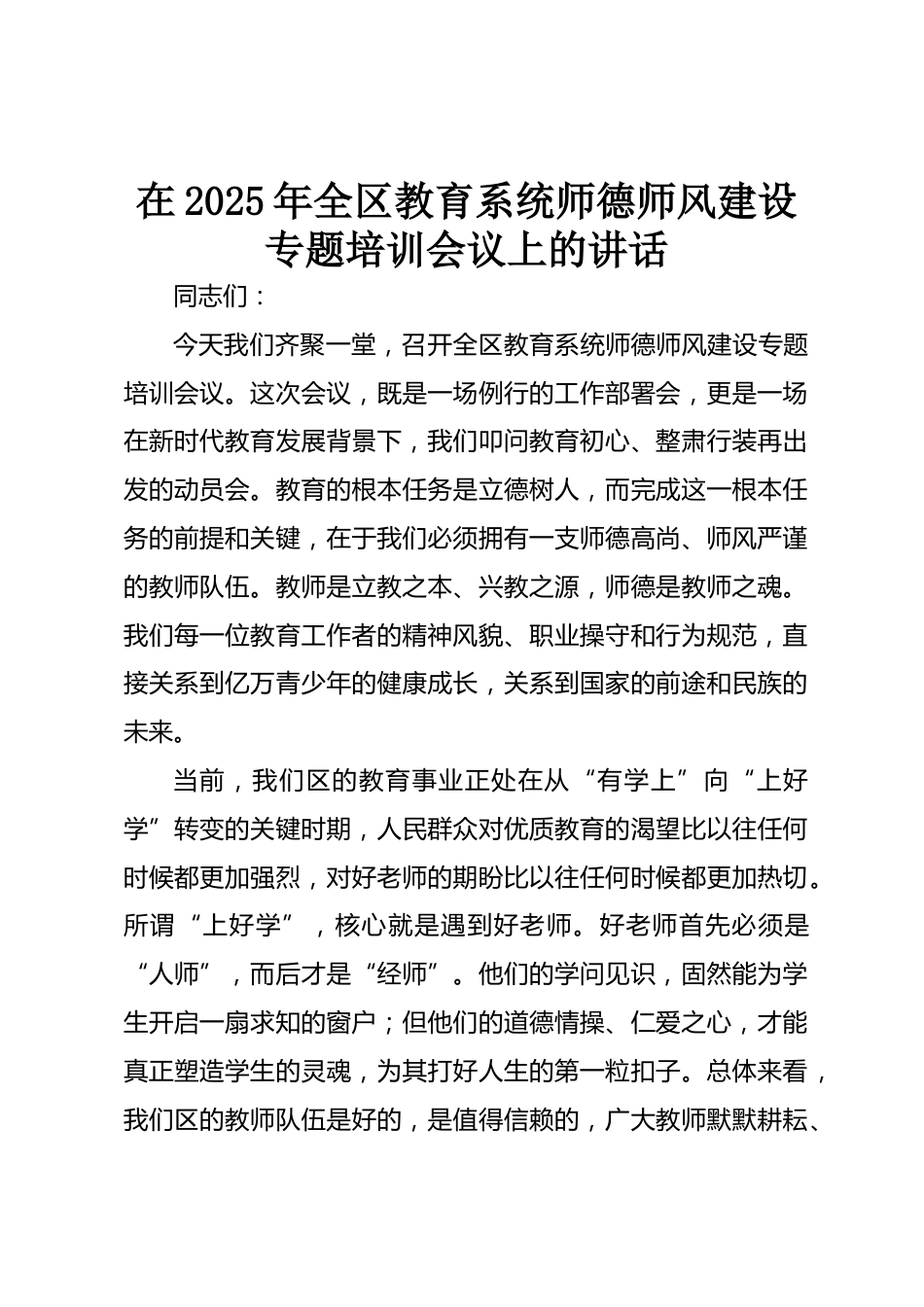在2025年全區(qū)教育系統(tǒng)師德師風(fēng)建設(shè)專題培訓(xùn)會(huì)議上的講話同志們:今天我們齊聚一堂,召開全區(qū)教育系統(tǒng)師德師風(fēng)建設(shè)專題培訓(xùn)會(huì)議。這次會(huì)議,既是一場(chǎng)例行的工作部署會(huì),更是一場(chǎng)在新時(shí)代教育發(fā)展背景下,我們叩問教育初心、整肅行裝再出發(fā)的動(dòng)員會(huì)。教育的根本任務(wù)是立德樹人,而完成這一根本任務(wù)的前提和關(guān)鍵,在于我們必須擁有一支師德高尚、師風(fēng)嚴(yán)謹(jǐn)?shù)慕處熽?duì)伍。教師是立教之本、興教之源,師德是教師之魂。我們每一位教育工作者的精神風(fēng)貌、職業(yè)操守和行為規(guī)范,直接關(guān)系到億萬青少年的健康成長(zhǎng),關(guān)系到國(guó)家的前途和民族的未來。當(dāng)前,我們區(qū)的教育事業(yè)正處在從“有學(xué)...