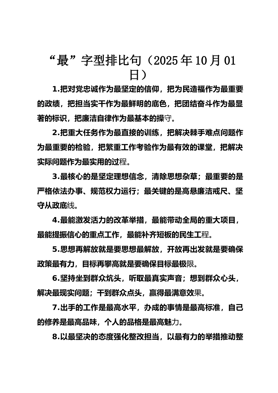 “最”字型排比句(2025年10月01日)1.把對(duì)黨忠誠(chéng)作為最堅(jiān)定的信仰,把為民造福作為最重要的政績(jī),把擔(dān)當(dāng)實(shí)干作為最鮮明的底色,把團(tuán)結(jié)奮斗作為最顯著的標(biāo)識(shí),把廉潔自律作為最基本的操守。2.把重大任務(wù)作為最直接的訓(xùn)練,把解決棘手難點(diǎn)問題作為最重要的檢驗(yàn),把繁重工作考驗(yàn)作為最有效的課堂,把解決實(shí)際問題作為最實(shí)用的過程。3.最核心的是堅(jiān)定理想信念,清除思想雜草;最重要的是嚴(yán)格依法辦事、規(guī)范權(quán)力運(yùn)行;最關(guān)鍵的是高懸廉潔戒尺、堅(jiān)守從政底線。4.最能激發(fā)活力的改革舉措,最能帶動(dòng)全局的重大項(xiàng)目,最能提振信心的重點(diǎn)工作,最能補(bǔ)齊短板的民生工程。5.思想再解...