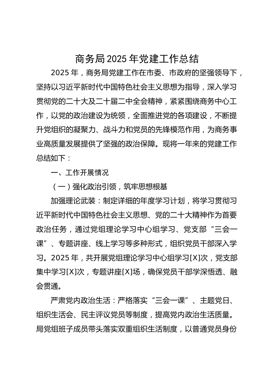 商務(wù)局2025年黨建工作總結(jié)2025年,商務(wù)局黨建工作在市委、市政府的堅(jiān)強(qiáng)領(lǐng)導(dǎo)下,堅(jiān)持以習(xí)近平新時(shí)代中國(guó)特色社會(huì)主義思想為指導(dǎo),深入學(xué)習(xí)貫徹黨的二十大及二十屆二中全會(huì)精神,緊緊圍繞商務(wù)中心工作,以黨的政治建設(shè)為統(tǒng)領(lǐng),全面推進(jìn)黨的各項(xiàng)建設(shè),不斷提升黨組織的凝聚力、戰(zhàn)斗力和黨員的先鋒模范作用,為商務(wù)事業(yè)高質(zhì)量發(fā)展提供了堅(jiān)強(qiáng)的政治保障?,F(xiàn)將一年來(lái)的黨建工作總結(jié)如下:一、工作開(kāi)展情況(一)強(qiáng)化政治引領(lǐng),筑牢思想根基加強(qiáng)理論武裝:制定詳細(xì)的年度學(xué)習(xí)計(jì)劃,將學(xué)習(xí)貫徹習(xí)近平新時(shí)代中國(guó)特色社會(huì)主義思想、黨的二十大精神作為首要政治任務(wù),通過(guò)黨組理論學(xué)...