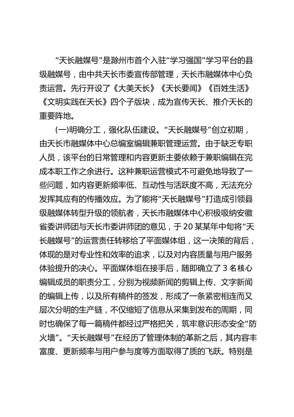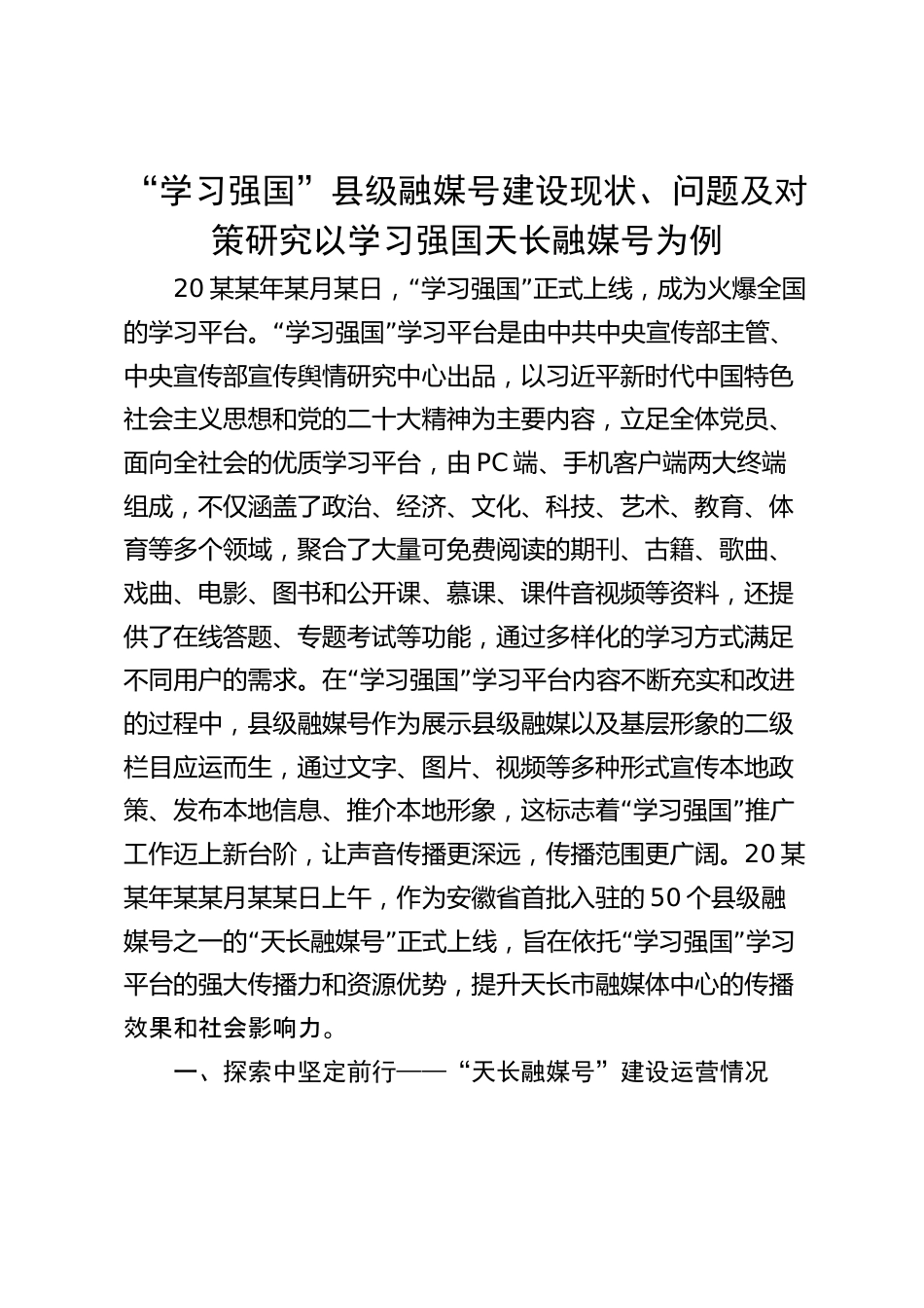 “學(xué)習(xí)強(qiáng)國”縣級融媒號建設(shè)現(xiàn)狀、問題及對策研究以學(xué)習(xí)強(qiáng)國天長融媒號為例20“”某某年某月某日,學(xué)習(xí)強(qiáng)國正式上線,成為火爆全國“”的學(xué)習(xí)平臺。學(xué)習(xí)強(qiáng)國學(xué)習(xí)平臺是由中共中央宣傳部主管、中央宣傳部宣傳輿情研究中心出品,以習(xí)近平新時(shí)代中國特色社會主義思想和黨的二十大精神為主要內(nèi)容,立足全體黨員、面向全社會的優(yōu)質(zhì)學(xué)習(xí)平臺,由PC端、手機(jī)客戶端兩大終端組成,不僅涵蓋了政治、經(jīng)濟(jì)、文化、科技、藝術(shù)、教育、體育等多個(gè)領(lǐng)域,聚合了大量可免費(fèi)閱讀的期刊、古籍、歌曲、戲曲、電影、圖書和公開課、慕課、課件音視頻等資料,還提供了在線答題、專題考試等功能,...