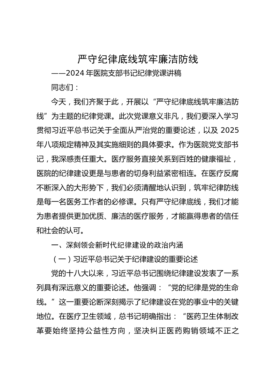 2024年醫(yī)院支部書(shū)記紀(jì)律黨課講稿:嚴(yán)守紀(jì)律底線 筑牢廉潔防線