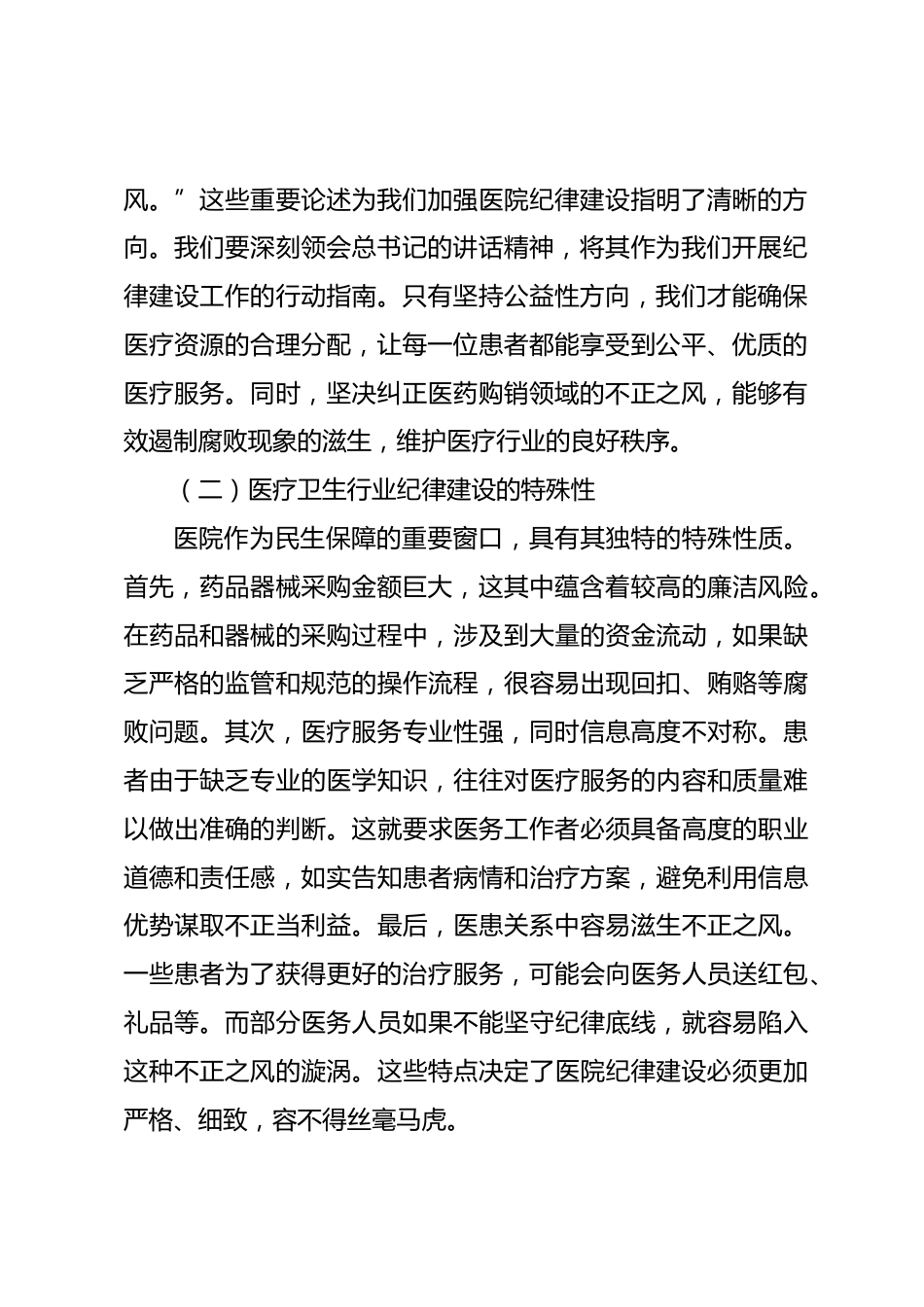嚴(yán)守紀(jì)律底線筑牢廉潔防線——2024年醫(yī)院支部書(shū)記紀(jì)律黨課講稿同志們:今天,我們齊聚于此,開(kāi)展以“嚴(yán)守紀(jì)律底線筑牢廉潔防線”為主題的紀(jì)律黨課。此次黨課意義非凡,我們要深入學(xué)習(xí)貫徹習(xí)近平總書(shū)記關(guān)于全面從嚴(yán)治黨的重要論述,以及2025年八項(xiàng)規(guī)定精神及其實(shí)施細(xì)則的具體要求。作為醫(yī)院黨支部書(shū)記,我深感責(zé)任重大。醫(yī)療服務(wù)直接關(guān)系到百姓的健康福祉,醫(yī)院的紀(jì)律建設(shè)更是與患者的切身利益緊密相連。在醫(yī)療反腐不斷深入的大形勢(shì)下,我們必須清醒地認(rèn)識(shí)到,筑牢紀(jì)律防線是每一名醫(yī)務(wù)工作者的必修課。只有嚴(yán)守紀(jì)律底線,我們才能為患者提供更加優(yōu)質(zhì)、廉潔的醫(yī)療服務(wù),才...