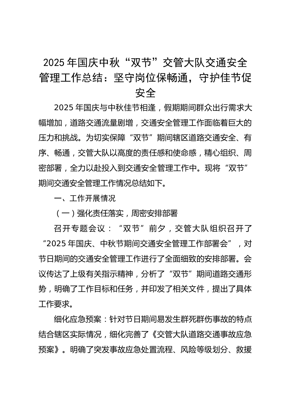 2025年國(guó)慶中秋“雙節(jié)”交管大隊(duì)交通安全管理工作總結(jié):堅(jiān)守崗位保暢通,守護(hù)佳節(jié)促安全2025年國(guó)慶與中秋佳節(jié)相逢,假期期間群眾出行需求大幅增加,道路交通流量劇增,交通安全管理工作面臨著巨大的壓力和挑戰(zhàn)。為切實(shí)保障“雙節(jié)”期間轄區(qū)道路交通安全、有序、暢通,交管大隊(duì)以高度的責(zé)任感和使命感,精心組織、周密部署,全力以赴投入到交通安全管理工作中。現(xiàn)將“雙節(jié)”期間交通安全管理工作情況總結(jié)如下。一、工作開(kāi)展情況(一)強(qiáng)化責(zé)任落實(shí),周密安排部署召開(kāi)專題會(huì)議:“雙節(jié)”前夕,交管大隊(duì)組織召開(kāi)了“2025年國(guó)慶、中秋節(jié)期間交通安全管理工作部署會(huì)”,對(duì)節(jié)日...