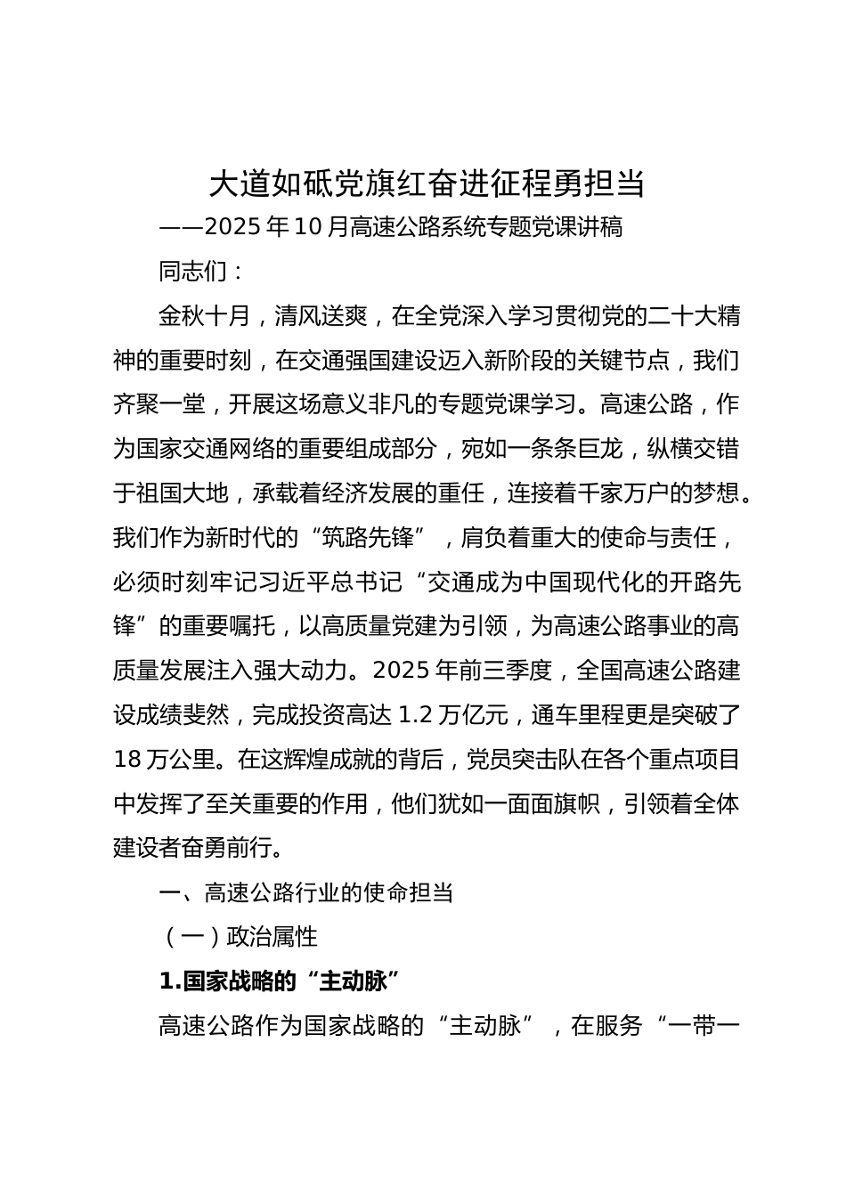 大道如砥黨旗紅奮進(jìn)征程勇?lián)?dāng)——2025年10月高速公路系統(tǒng)專題黨課講稿同志們:金秋十月,清風(fēng)送爽,在全黨深入學(xué)習(xí)貫徹黨的二十大精神的重要時(shí)刻,在交通強(qiáng)國建設(shè)邁入新階段的關(guān)鍵節(jié)點(diǎn),我們齊聚一堂,開展這場意義非凡的專題黨課學(xué)習(xí)。高速公路,作為國家交通網(wǎng)絡(luò)的重要組成部分,宛如一條條巨龍,縱橫交錯(cuò)于祖國大地,承載著經(jīng)濟(jì)發(fā)展的重任,連接著千家萬戶的夢想。我們作為新時(shí)代的“筑路先鋒”,肩負(fù)著重大的使命與責(zé)任,必須時(shí)刻牢記習(xí)近平總書記“交通成為中國現(xiàn)代化的開路先鋒”的重要囑托,以高質(zhì)量黨建為引領(lǐng),為高速公路事業(yè)的高質(zhì)量發(fā)展注入強(qiáng)大動(dòng)力。2025年...