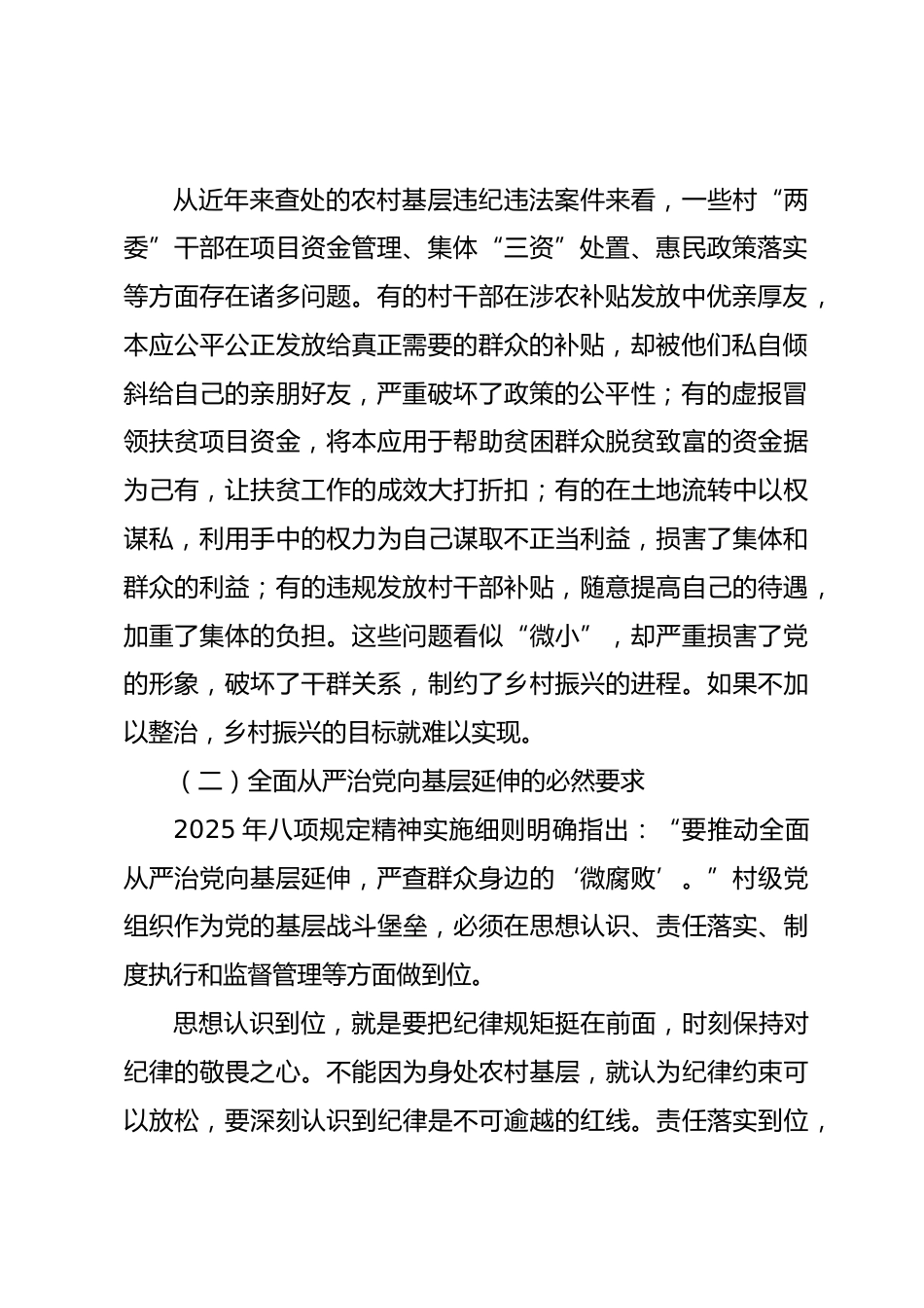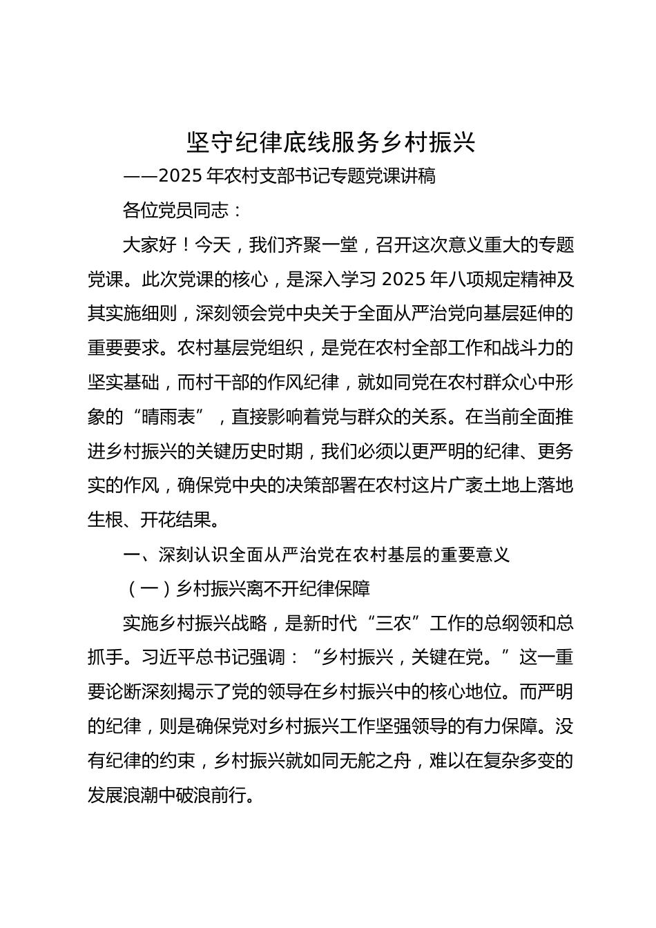 堅(jiān)守紀(jì)律底線服務(wù)鄉(xiāng)村振興——2025年農(nóng)村支部書(shū)記專題黨課講稿各位黨員同志:大家好!今天,我們齊聚一堂,召開(kāi)這次意義重大的專題黨課。此次黨課的核心,是深入學(xué)習(xí)2025年八項(xiàng)規(guī)定精神及其實(shí)施細(xì)則,深刻領(lǐng)會(huì)黨中央關(guān)于全面從嚴(yán)治黨向基層延伸的重要要求。農(nóng)村基層黨組織,是黨在農(nóng)村全部工作和戰(zhàn)斗力的堅(jiān)實(shí)基礎(chǔ),而村干部的作風(fēng)紀(jì)律,就如同黨在農(nóng)村群眾心中形象的“晴雨表”,直接影響著黨與群眾的關(guān)系。在當(dāng)前全面推進(jìn)鄉(xiāng)村振興的關(guān)鍵歷史時(shí)期,我們必須以更嚴(yán)明的紀(jì)律、更務(wù)實(shí)的作風(fēng),確保黨中央的決策部署在農(nóng)村這片廣袤土地上落地生根、開(kāi)花結(jié)果。一、深刻認(rèn)識(shí)全面...