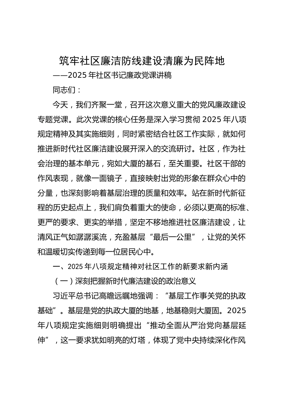 2025年社區(qū)書記廉政黨課講稿:筑牢社區(qū)廉潔防線 建設(shè)清廉為民陣地
