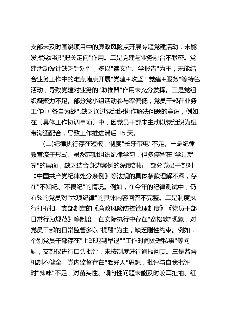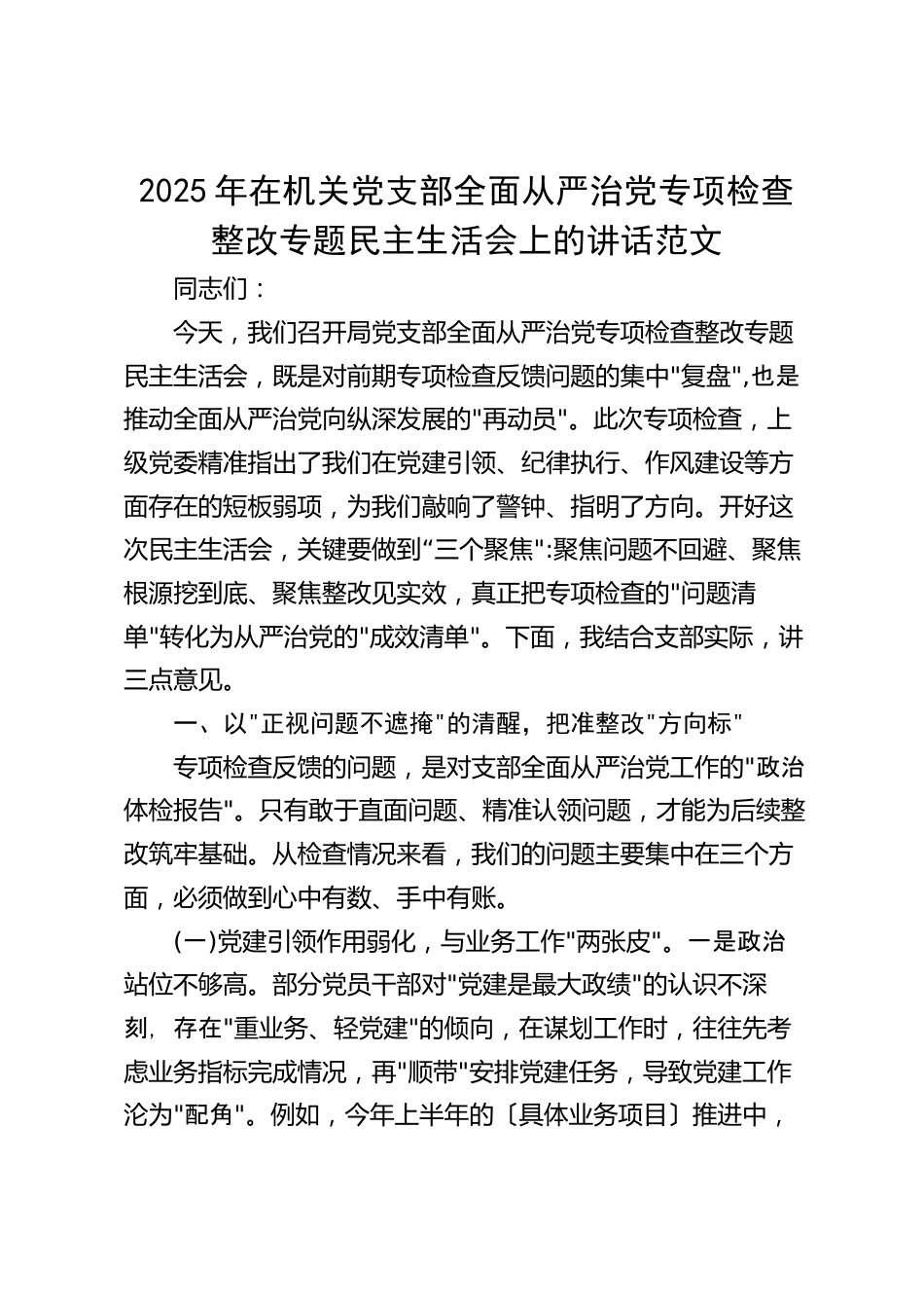 2025年在機關(guān)黨支部全面從嚴(yán)治黨專項檢查整改專題民主生活會上的講話范文同志們:今天,我們召開局黨支部全面從嚴(yán)治黨專項檢查整改專題民主生活會,既是對前期專項檢查反饋問題的集中"復(fù)盤",也是推動全面從嚴(yán)治黨向縱深發(fā)展的"再動員"。此次專項檢查,上級黨委精準(zhǔn)指出了我們在黨建引領(lǐng)、紀(jì)律執(zhí)行、作風(fēng)建設(shè)等方面存在的短板弱項,為我們敲響了警鐘、指明了方向。開好這“次民主生活會,關(guān)鍵要做到三個聚焦":聚焦問題不回避、聚焦根源挖到底、聚焦整改見實效,真正把專項檢查的"問題清單"轉(zhuǎn)化為從嚴(yán)治黨的"成效清單"。下面,我結(jié)合支部實際,講三點意見。一、以"正視問題...