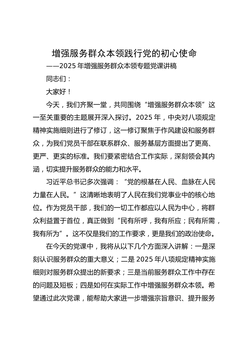 增強(qiáng)服務(wù)群眾本領(lǐng)踐行黨的初心使命——2025年增強(qiáng)服務(wù)群眾本領(lǐng)專題黨課講稿同志們:大家好!今天,我們齊聚一堂,共同圍繞“增強(qiáng)服務(wù)群眾本領(lǐng)”這一至關(guān)重要的主題展開深入探討。2025年,中央對(duì)八項(xiàng)規(guī)定精神實(shí)施細(xì)則進(jìn)行了修訂,這一修訂聚焦于作風(fēng)建設(shè)和服務(wù)群眾,為我們黨員干部在聯(lián)系群眾、服務(wù)基層方面提出了更高、更嚴(yán)、更實(shí)的標(biāo)準(zhǔn)。我們要緊密結(jié)合工作實(shí)際,深刻領(lǐng)會(huì)其內(nèi)涵,切實(shí)提升服務(wù)群眾的能力和水平。習(xí)近平總書記多次強(qiáng)調(diào):“黨的根基在人民、血脈在人民力量在人民。”這清晰地表明了人民在我們黨事業(yè)中的核心地位。作為黨員干部,我們的一切工作都應(yīng)以人民...