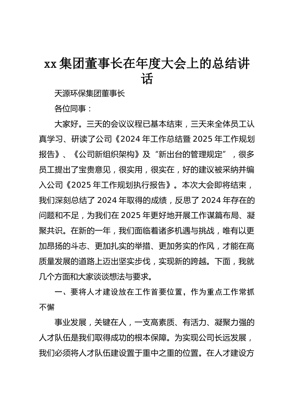 xx集團(tuán)董事長在年度大會上的總結(jié)講話天源環(huán)保集團(tuán)董事長各位同事:大家好。三天的會議議程已基本結(jié)束,三天來全體員工認(rèn)真學(xué)習(xí)、研讀了公司《2024年工作總結(jié)暨2025年工作規(guī)劃報告》、《公司新組織架構(gòu)》及“新出臺的管理規(guī)定”,很多員工提出了寶貴意見,很實用,很實在,好的建議被采納并編入公司《2025年工作規(guī)劃執(zhí)行報告》。本次大會即將結(jié)束,我們深刻總結(jié)了2024年取得的成績,反思了2024年存在的問題和不足,為我們在2025年更好地開展工作謀篇布局、凝聚共識。在新的一年,我們面臨著諸多機遇與挑戰(zhàn),唯有以更加昂揚的斗志、更加扎實的舉措、更加務(wù)實的作風(fēng),才能在...