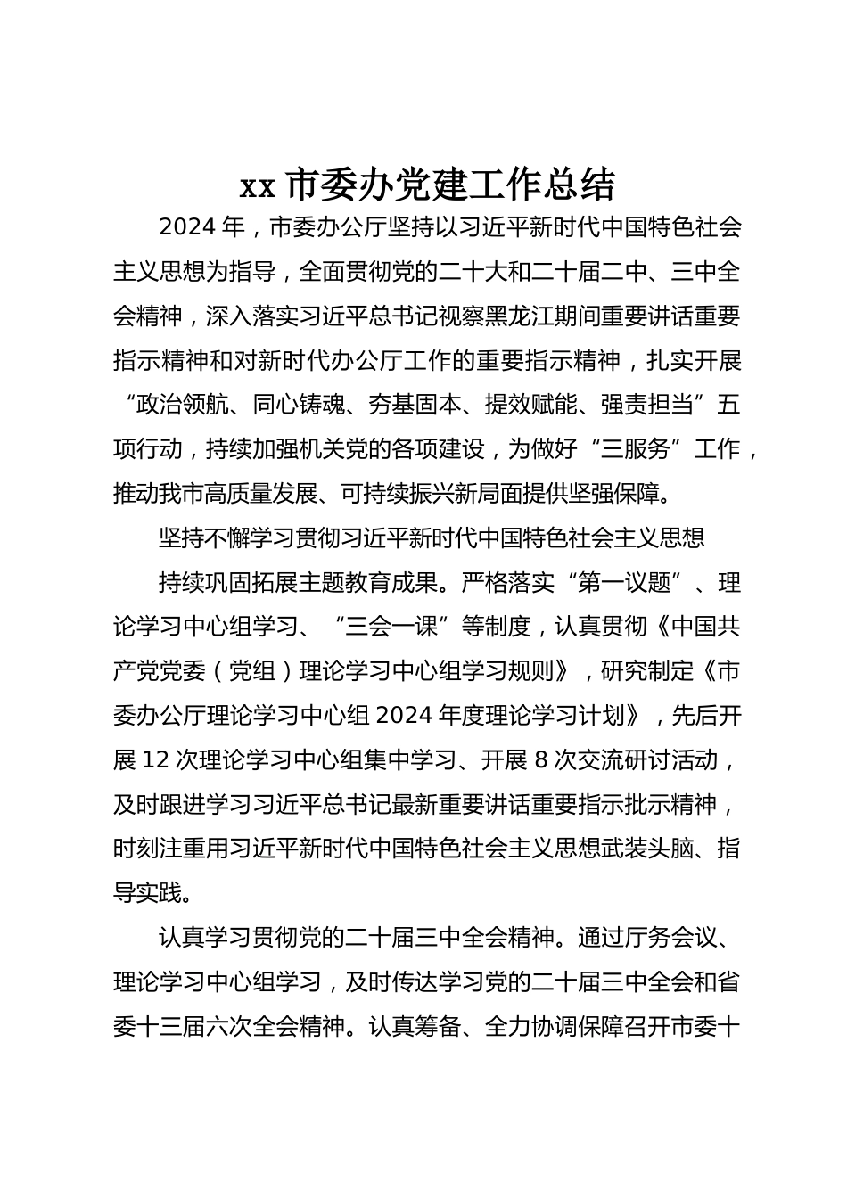 xx市委辦黨建工作總結(jié)2024年,市委辦公廳堅(jiān)持以習(xí)近平新時代中國特色社會主義思想為指導(dǎo),全面貫徹黨的二十大和二十屆二中、三中全會精神,深入落實(shí)習(xí)近平總書記視察黑龍江期間重要講話重要指示精神和對新時代辦公廳工作的重要指示精神,扎實(shí)開展“政治領(lǐng)航、同心鑄魂、夯基固本、提效賦能、強(qiáng)責(zé)擔(dān)當(dāng)”五項(xiàng)行動,持續(xù)加強(qiáng)機(jī)關(guān)黨的各項(xiàng)建設(shè),為做好“三服務(wù)”工作,推動我市高質(zhì)量發(fā)展、可持續(xù)振興新局面提供堅(jiān)強(qiáng)保障。堅(jiān)持不懈學(xué)習(xí)貫徹習(xí)近平新時代中國特色社會主義思想持續(xù)鞏固拓展主題教育成果。嚴(yán)格落實(shí)“第一議題”、理論學(xué)習(xí)中心組學(xué)習(xí)、“三會一課”等制度,認(rèn)真貫...