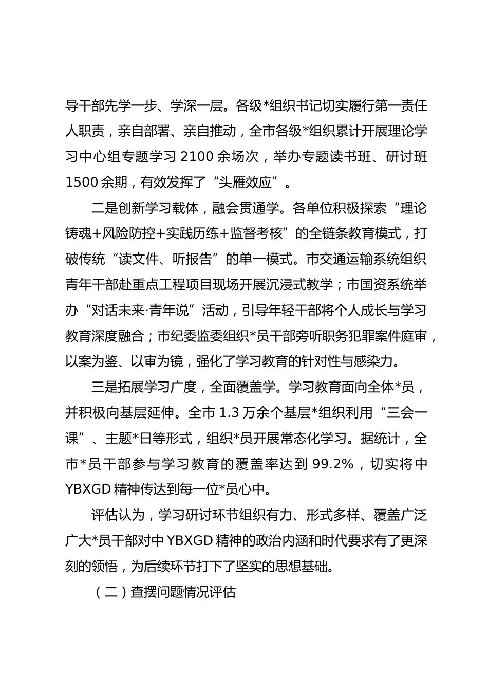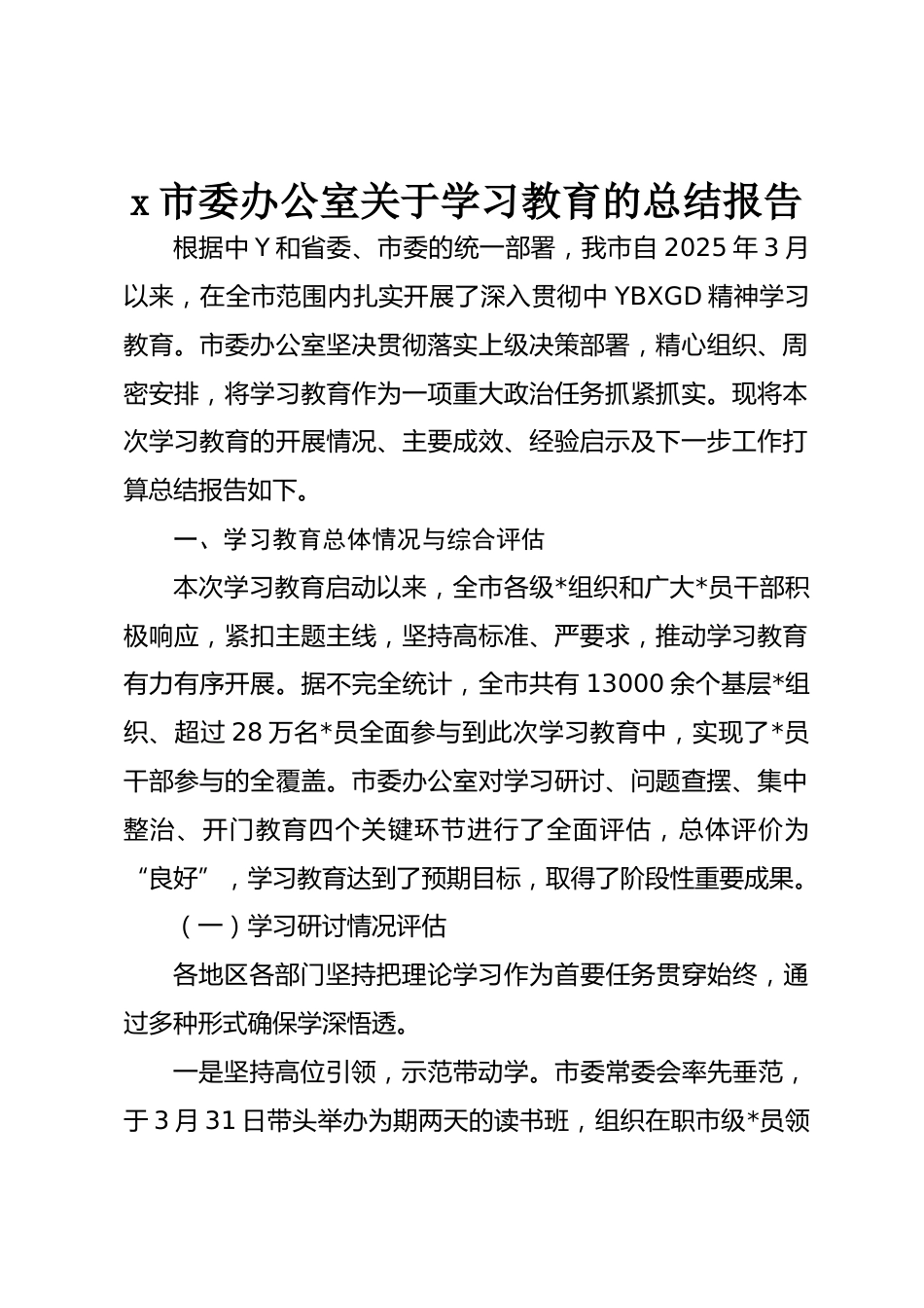 x市委辦公室關(guān)于學(xué)習(xí)教育的總結(jié)報(bào)告根據(jù)中Y和省委、市委的統(tǒng)一部署,我市自2025年3月以來,在全市范圍內(nèi)扎實(shí)開展了深入貫徹中YBXGD精神學(xué)習(xí)教育。市委辦公室堅(jiān)決貫徹落實(shí)上級(jí)決策部署,精心組織、周密安排,將學(xué)習(xí)教育作為一項(xiàng)重大政治任務(wù)抓緊抓實(shí)?,F(xiàn)將本次學(xué)習(xí)教育的開展情況、主要成效、經(jīng)驗(yàn)啟示及下一步工作打算總結(jié)報(bào)告如下。一、學(xué)習(xí)教育總體情況與綜合評(píng)估本次學(xué)習(xí)教育啟動(dòng)以來,全市各級(jí)*組織和廣大*員干部積極響應(yīng),緊扣主題主線,堅(jiān)持高標(biāo)準(zhǔn)、嚴(yán)要求,推動(dòng)學(xué)習(xí)教育有力有序開展。據(jù)不完全統(tǒng)計(jì),全市共有13000余個(gè)基層*組織、超過28萬名*員全面參與到此次學(xué)習(xí)...