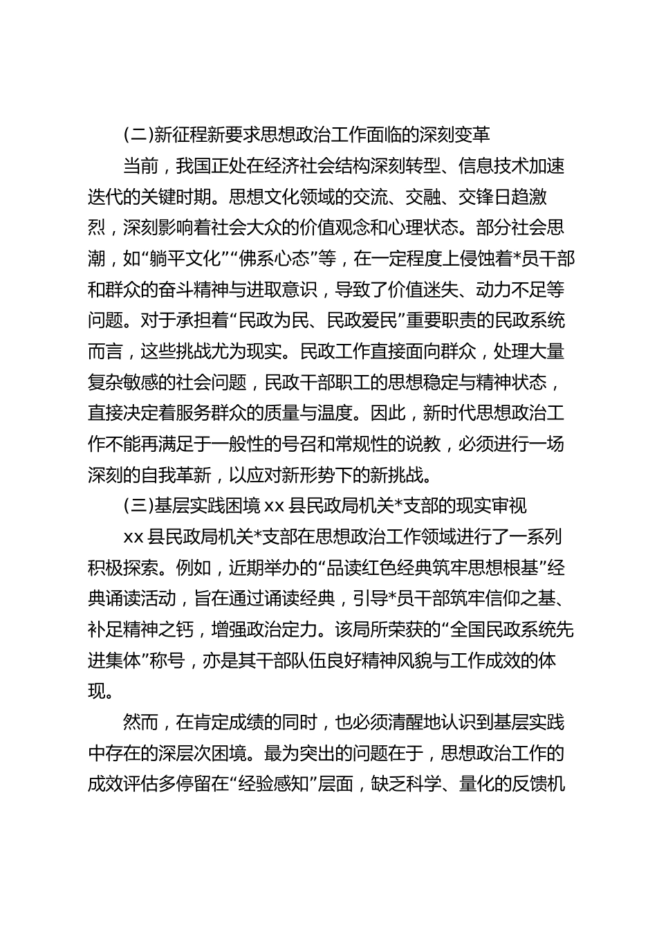 x縣民政局機關(guān)*支部關(guān)于增強新時代思想政治工作時效性的研究報告進入新時代,思想政治工作作為我們*的優(yōu)良傳統(tǒng)與生命線工程,其重要性愈發(fā)凸顯。思想政治工作本質(zhì)上是做人的工作,必須緊扣時代脈搏,回應(yīng)現(xiàn)實關(guān)切。本報告旨在結(jié)合xx縣民政局機關(guān)*支部的具體實踐,系統(tǒng)分析當(dāng)前基層思想政治工作面臨的挑戰(zhàn),并深入研究增強其時效性的方法路徑,以期為推動新時代基層dj工作提質(zhì)增效提供理論參考與實踐指引。一、新時代基層思想政治工作的時代背景與現(xiàn)實挑戰(zhàn)思想政治工作的效能,直接關(guān)系到*的路線方針政策在基層的貫徹執(zhí)行,關(guān)系到*員干部的精神面貌與戰(zhàn)斗力。準(zhǔn)確把握其所...